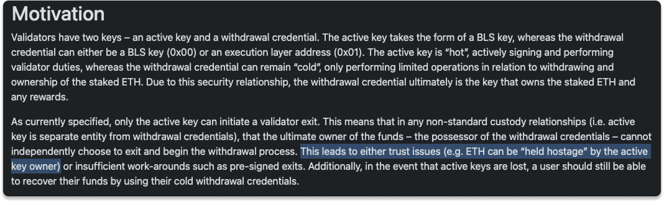 However, only the active key can initiate the withdrawal process, creating potential issues if it is lost, compromised, or held by a separate entity from the withdrawal key owner. In cases where node operators (who control the active key) manage staking on behalf of stakers (who hold the withdrawal key), stakers must rely on them to process withdrawals.