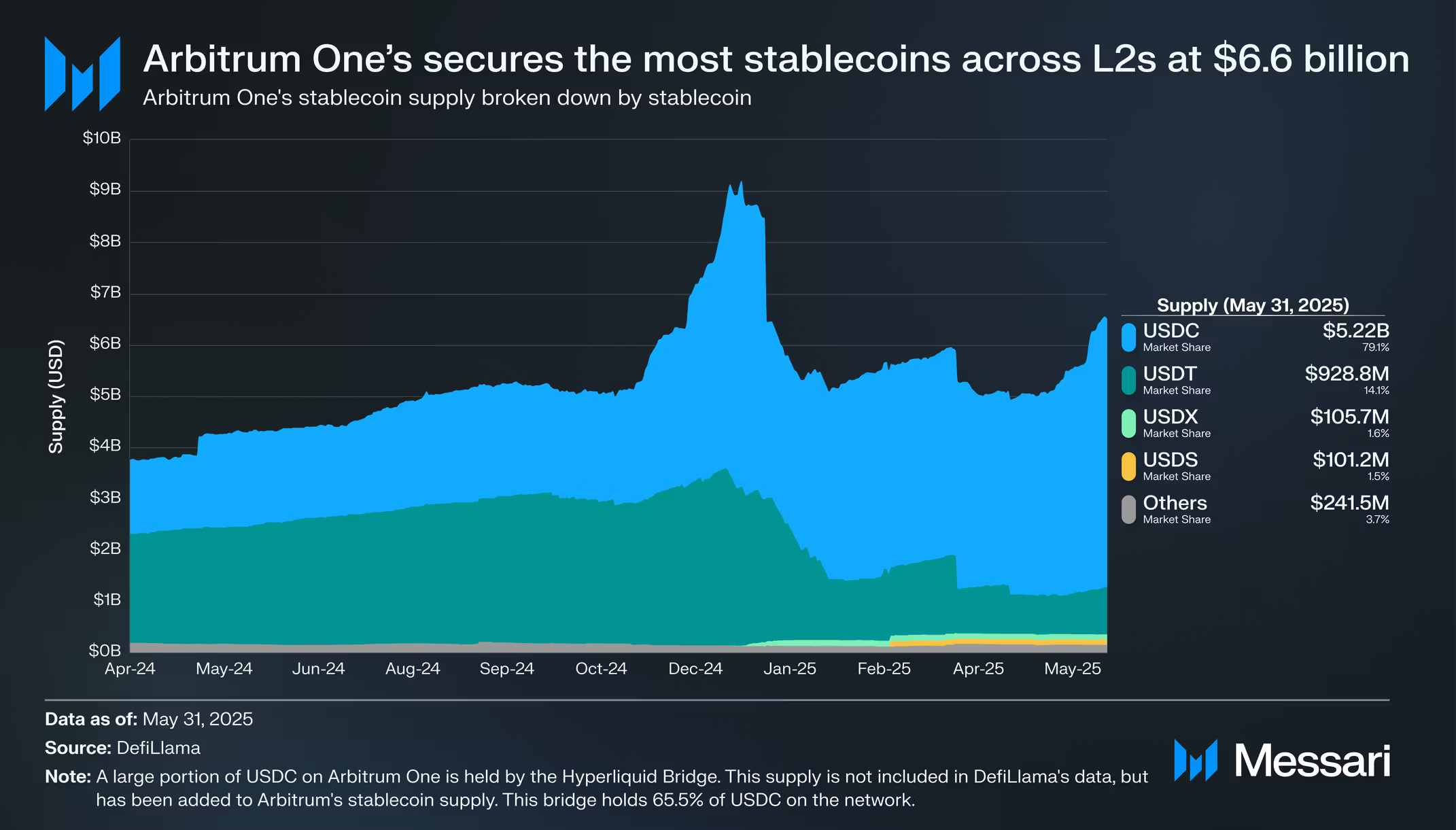 Since launch, Arbitrum has processed more than 2 billion ERC-20 token transfers, including 600+ million stablecoin transfers. Its top six stablecoins hold a combined onchain market cap of $7.16B, making Arbitrum the top L2 by stablecoin value secured, according to Messari.