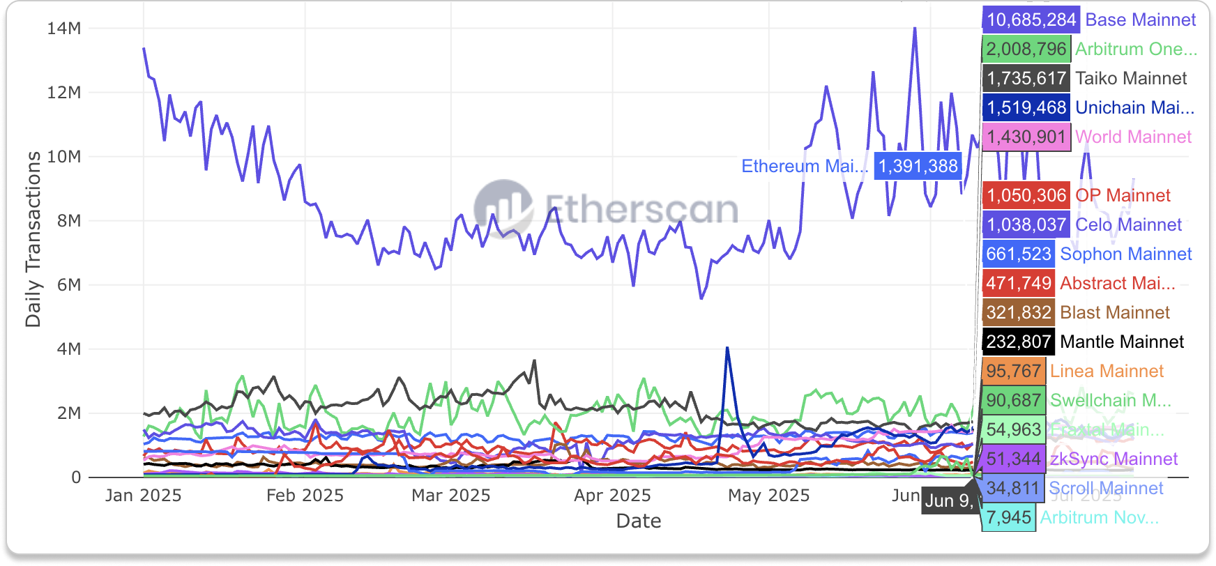 Since the start of 2025, Ethereum ecosystem chains tracked by Etherscan have processed nearly 4 billion transactions, a powerful signal of onchain activity scaling up. Base led the surge with 1.66 billion transactions (43.6%), outpacing Taiko at 388 million (10.2%) and Arbitrum One at 382 million (10%).