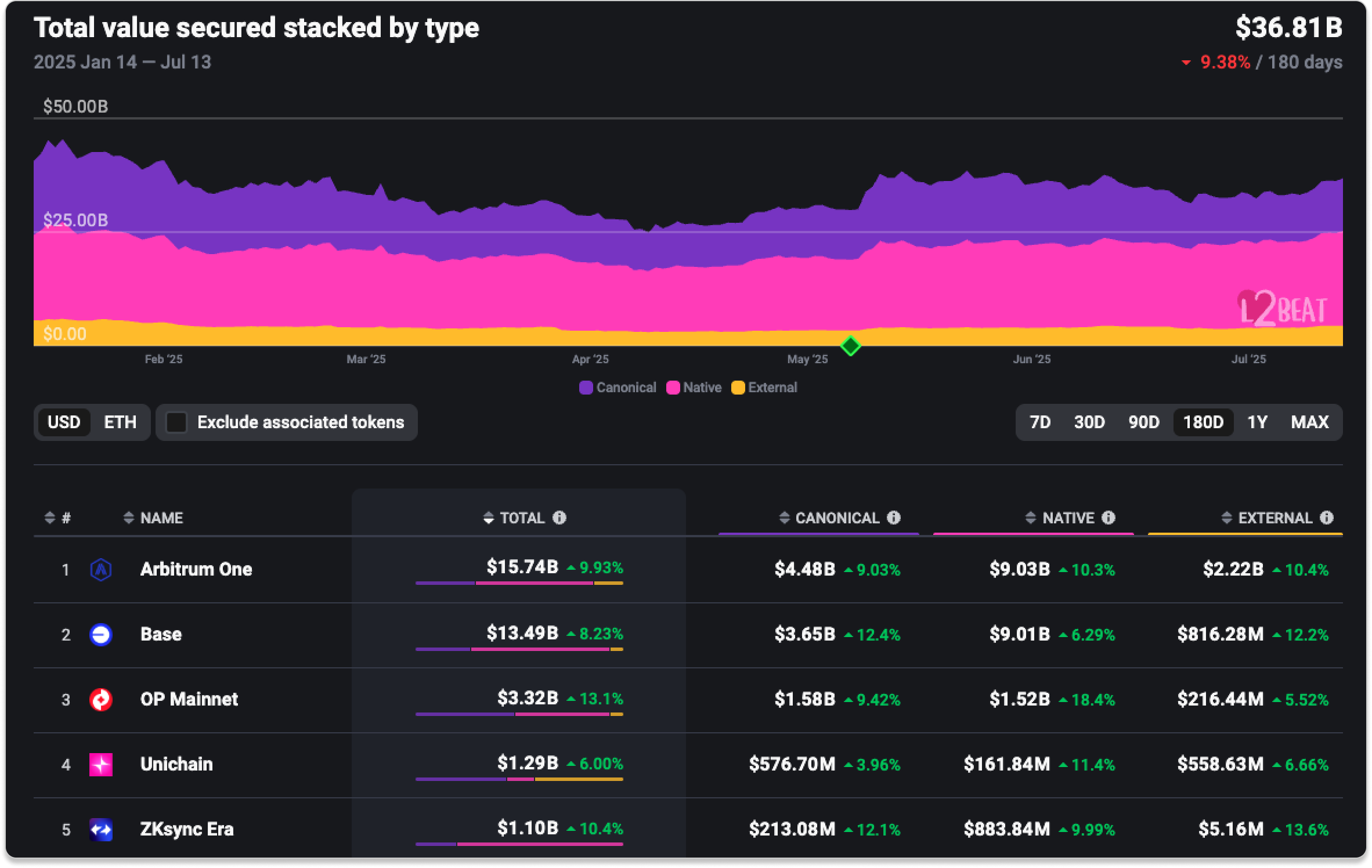 Arbitrum One, the leading Layer 2 by total value secured, offers a window into this value expansion. It currently secures $15.74 billion, ahead of Base and OP Mainnet, emerging as a preferred environment for transferring and settling value onchain.