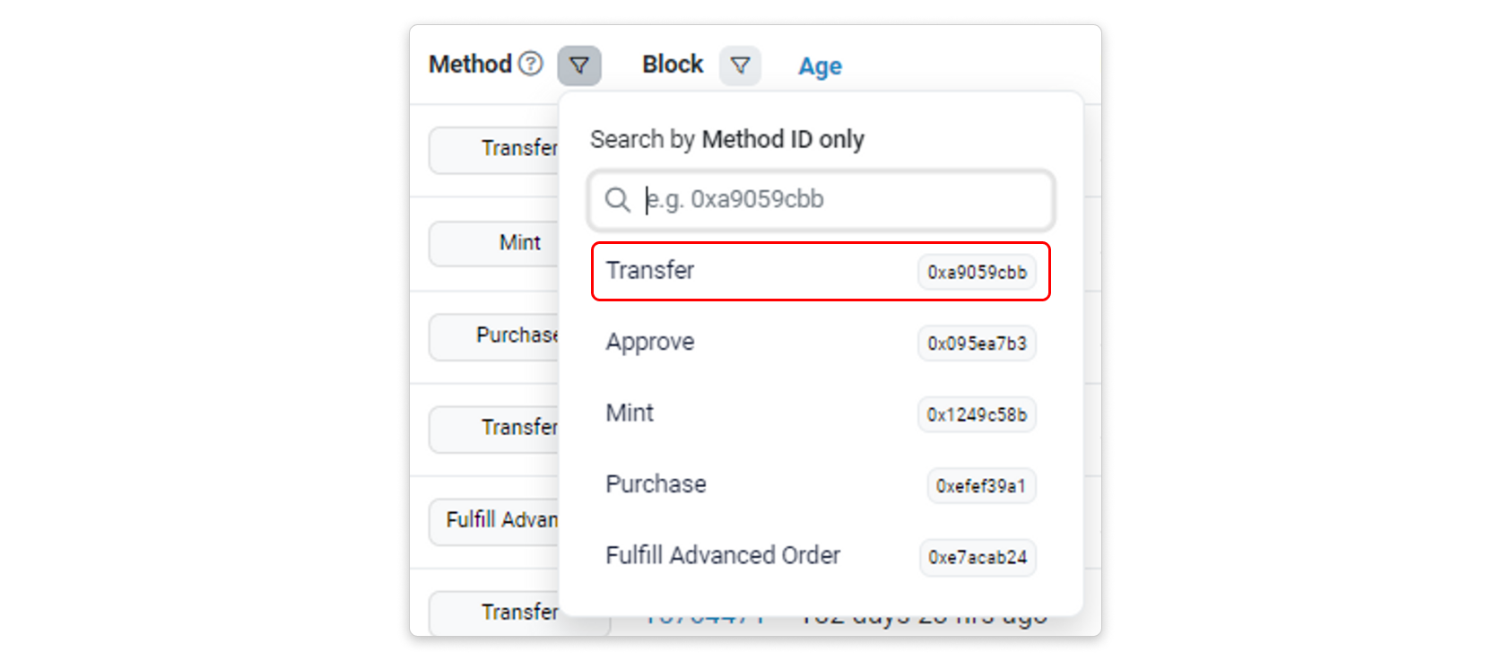 0xa9059cbbdecodes into thetransferfunction with parametersaddress _toanduint256 _value. Function name is displayed if it is identifiable from the decoded input data. You can filter transactions based on the similar function name. For unidentified functions, you can filter transactions based on the similar method ID.