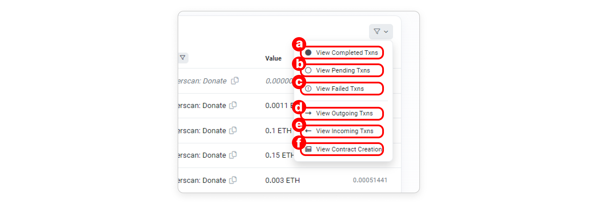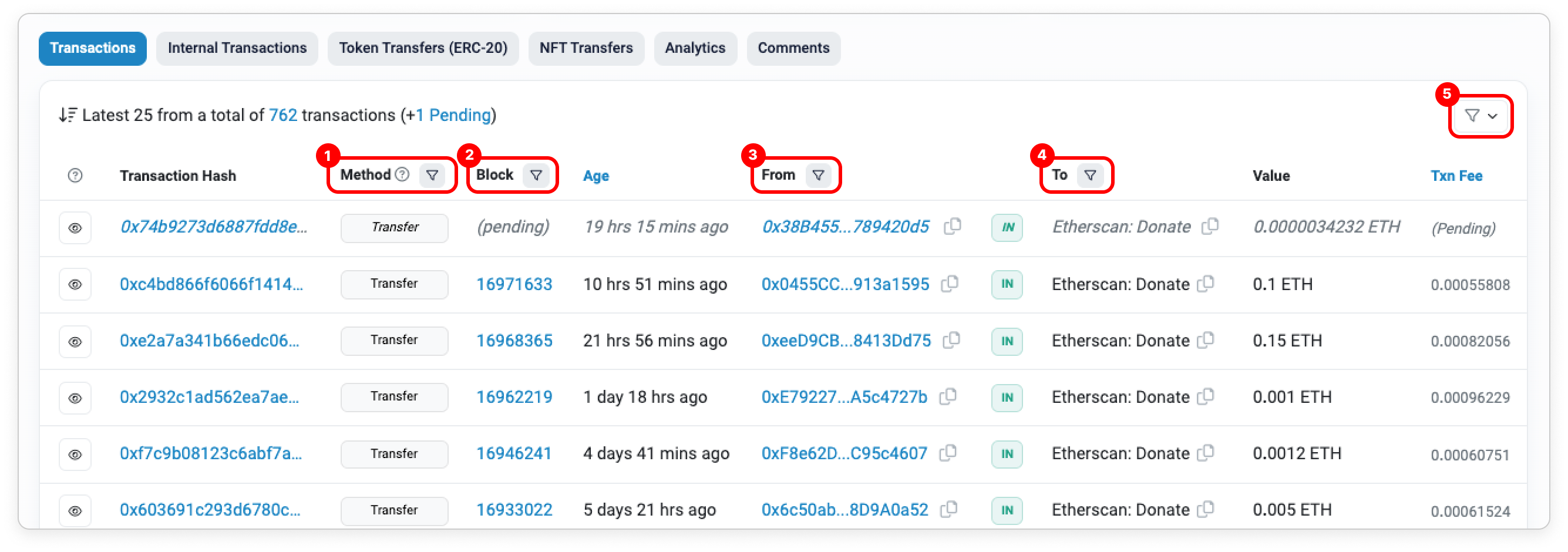 The number of transactions associated with an Ethereum address can grow over time, potentially making it difficult to track and analyze its activity. This is where transaction filters come in handy. There are 4 types of transaction filters to make tracking and analyzing address activity easier: