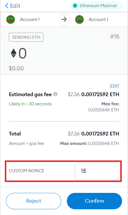 Some wallet interfaces provide you with options to set a higher gas fee than their default suggestion and change a transaction’s nonce.