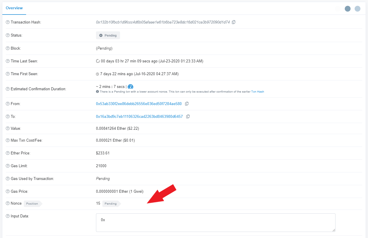 - Go back to your pending transaction’s Transaction Details page on Etherscan. Make sure the status is still at Pending and take note of its nonce number. You are going to need it in the coming steps.
