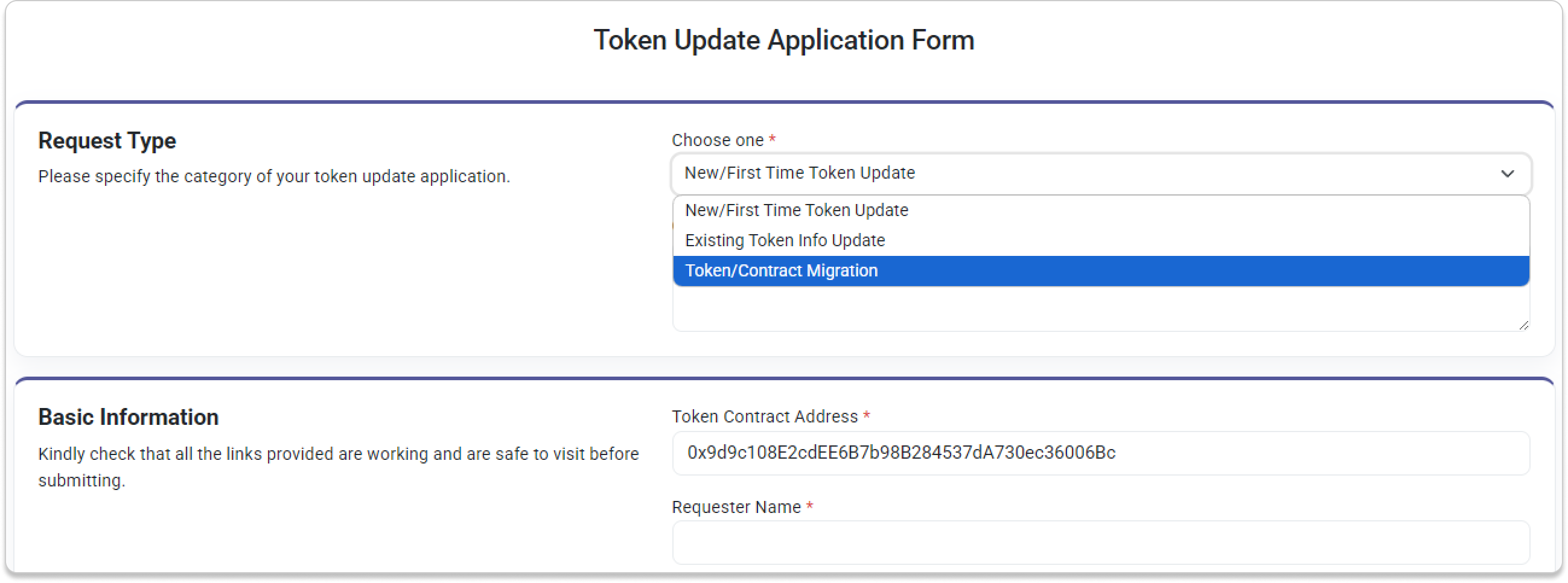 - Token/Contract Migration - This is for tokens that are migrating to a new contract address and you are looking to inform us that your old token has migrated to a new address (for more information on submitting for a token migration, please refer here)
