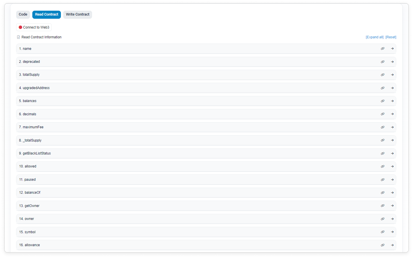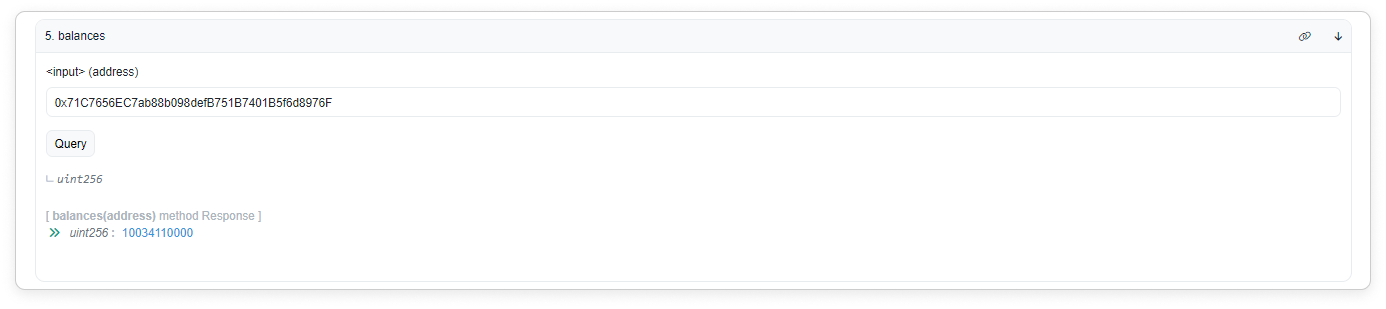By clicking onto the function, you will be able to interact with the code. Depending on the function, some of them will only display information about the contract as shown below.