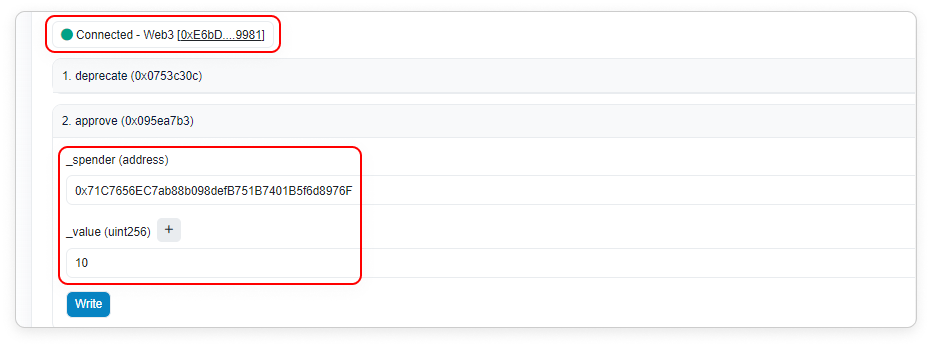 Once connected, you can start interacting with the contract. To show an example, we are interacting with the [approve] function that allows the other address to spend on your behalf depending on the amount set. We are approving Etherscan: Donate address to spend a maximum of 10 USDT on your behalf as shown below.