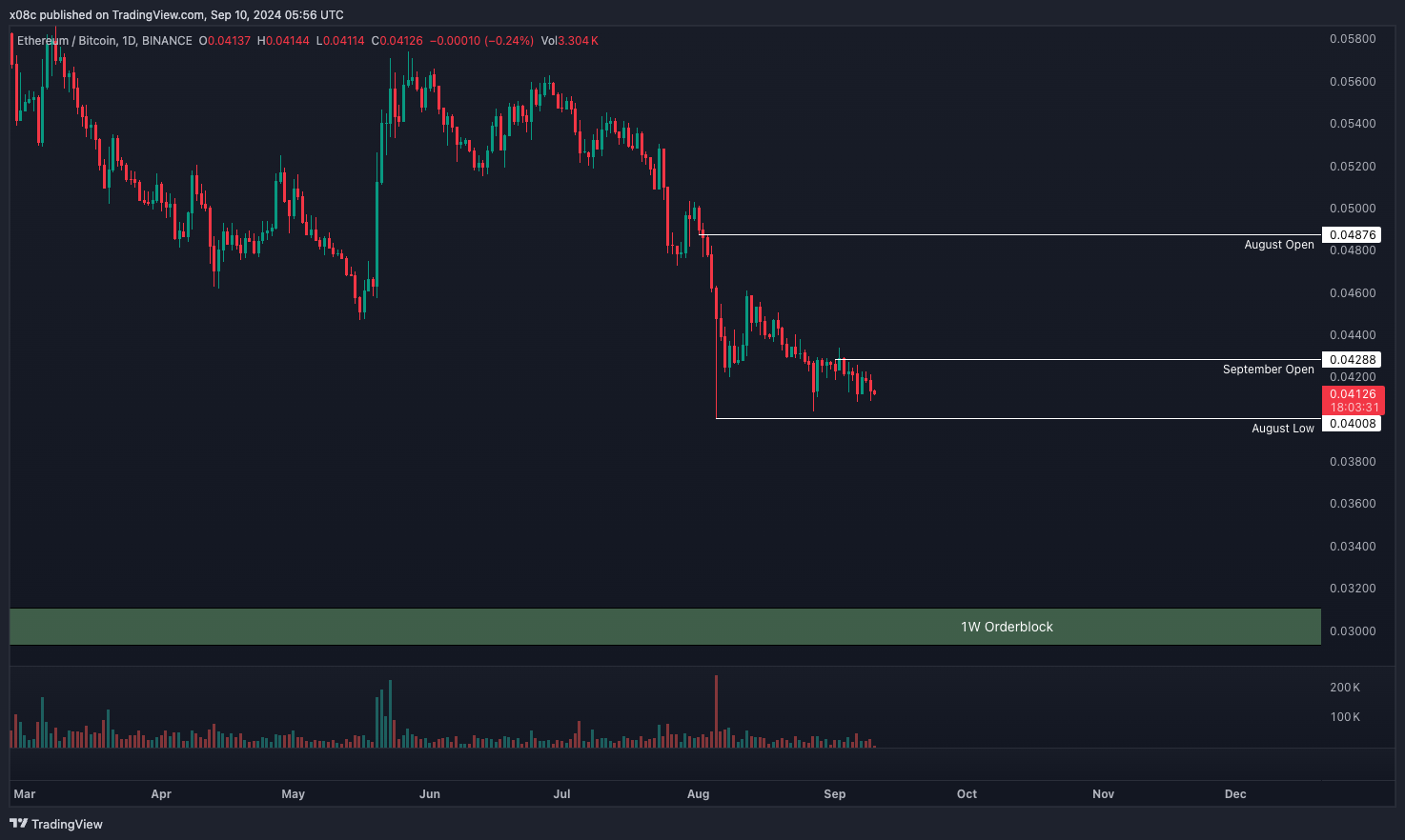 ETH continues it’s 2 year downtrend against BTC, closing the monthly down 12%, with the August low print of 0.04 showing us prices not seen since April ‘21. Acceptance below the 0.04 handle should accelerate the retrace to 1W orderblock support ~0.03, without much technical support in between.