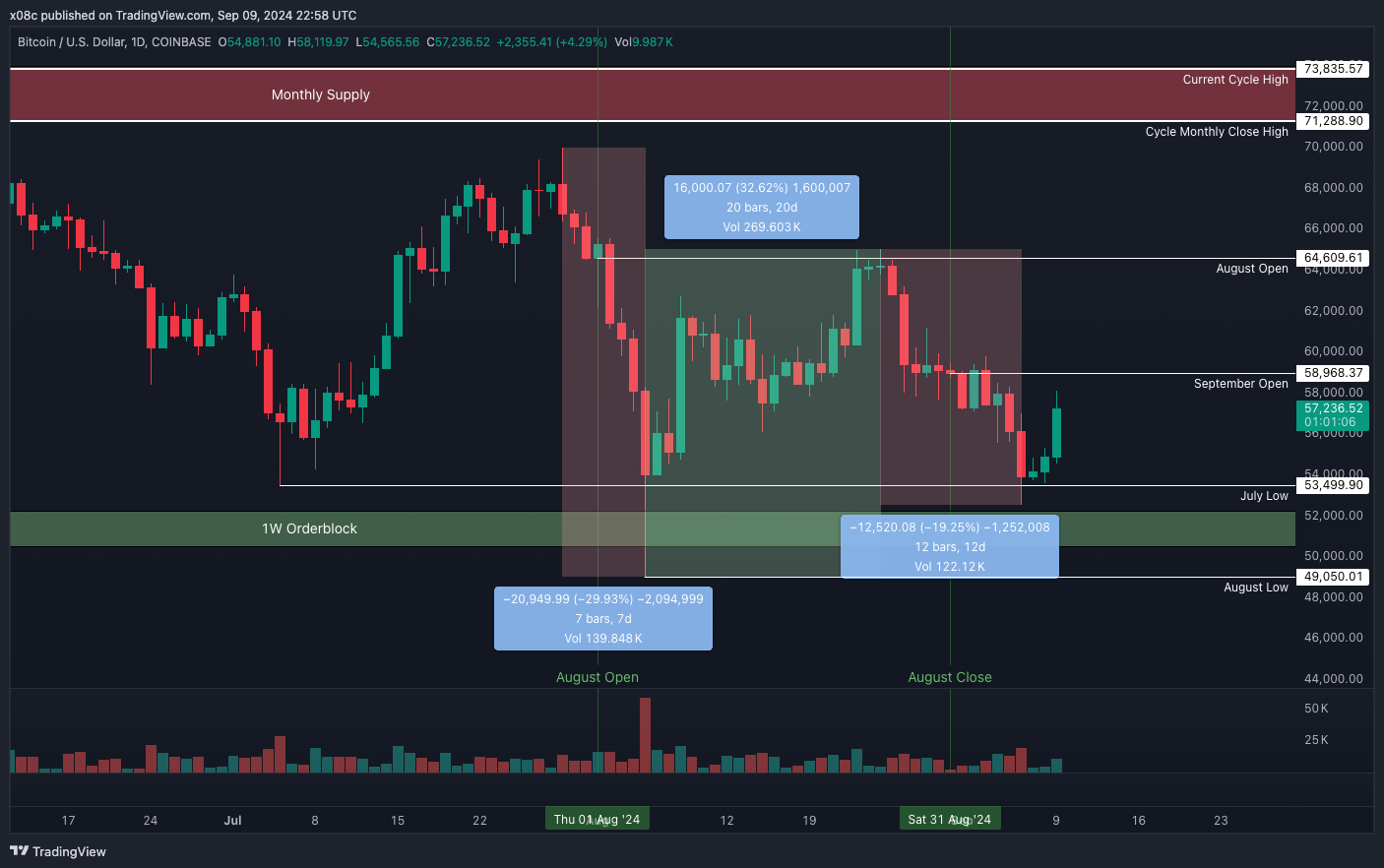 Immediate high timeframe resistance sits at September Open ~$59k, while the more crucial test waits at August Open - a close above which would print a higher high, providing more evidence of an uptrend forming and thus paving a path to test monthly supply in the $71-74k region.