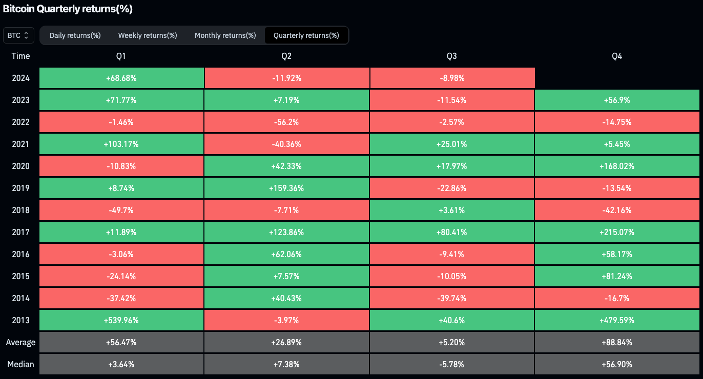 September is historically the worst month for BTC performance, with the month closing red for 7 out of the past 11 years. However, Q4 tends to be bullish, with only 11 red months printed out of a potential 33. Moreover, during the past 3 halving years - 2016 and 2020 - Q4 saw only green monthly prints averaging 17% and 39.2% respectively, translating into quarterly gains of 58.18% and 168% respectively.