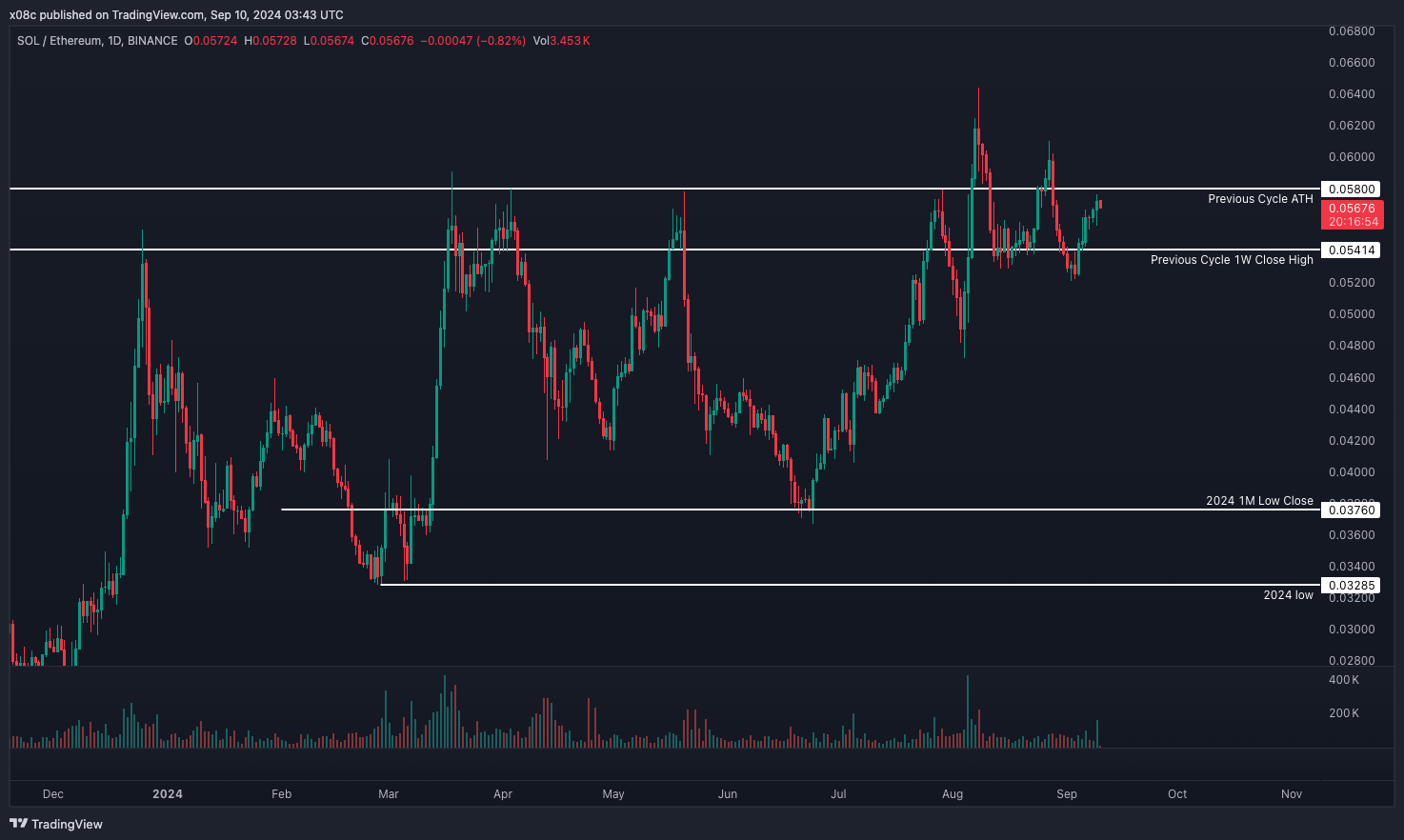 The most important development from last month’s analysis is the failure of the blue-sky breakout on the SOL/ETH ratio. The consolidation since has printed a lower high and lower low already, whilst currently forming a second potential lower high. A subsequent second lower low below 0.052 would provide further confirmation of a downtrend, while bulls will be looking for closes above the mid August high ~0.06 to open up the pathway to new highs.