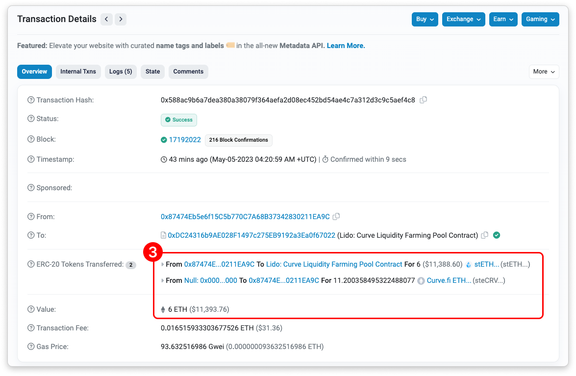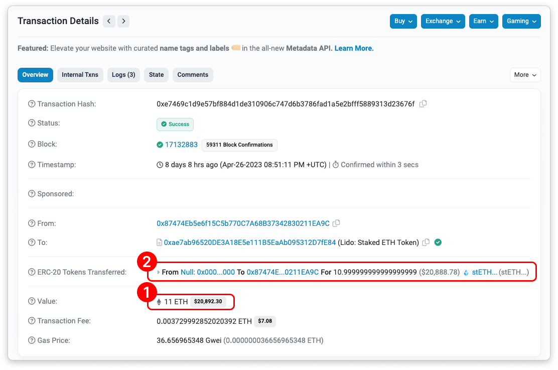 Illustration of Liquid Staking on Lido Finance (with examples on Etherscan):