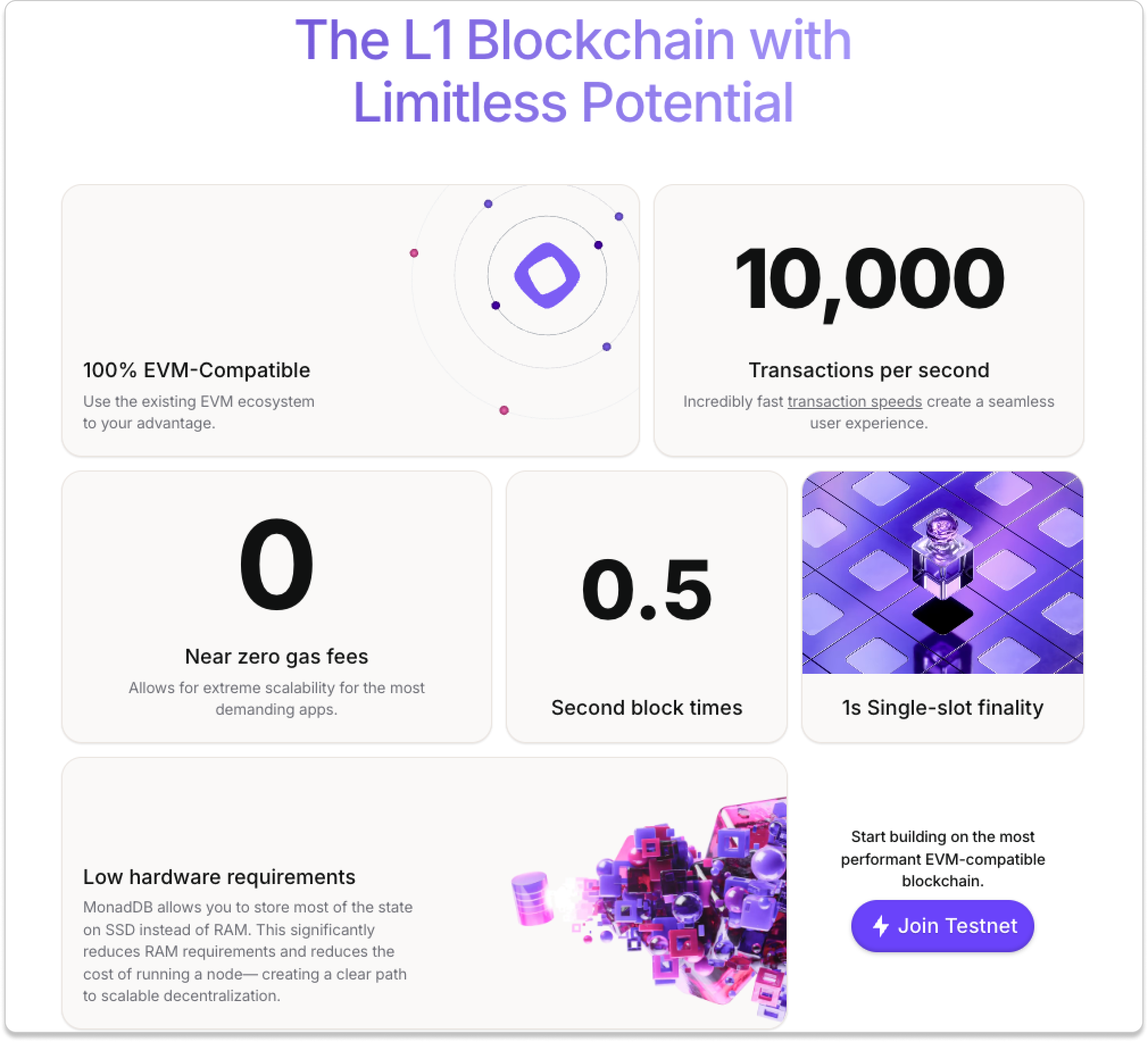 Monad is a high-performance, Ethereum-compatible Layer 1 (L1) blockchain designed to offer both compatibility and performance. Its testnet allows developers and users to experience its advanced features firsthand.