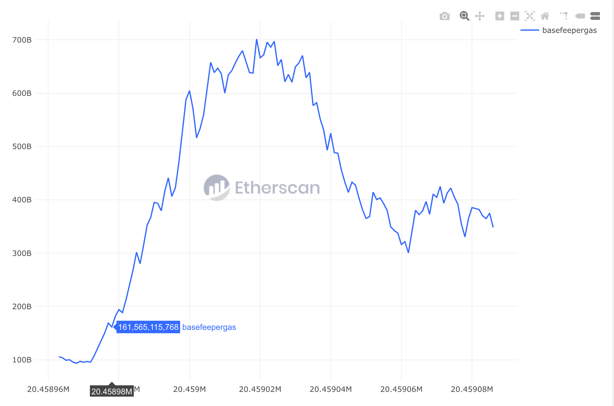 Apart from vanilla builders, MEV builders with less access to private transactions also contribute to this phenomenon. Let's look at a recent gas price hike during August 5th, 2024, where the peak base fee reaches 701.7 gwei at block 20459019.