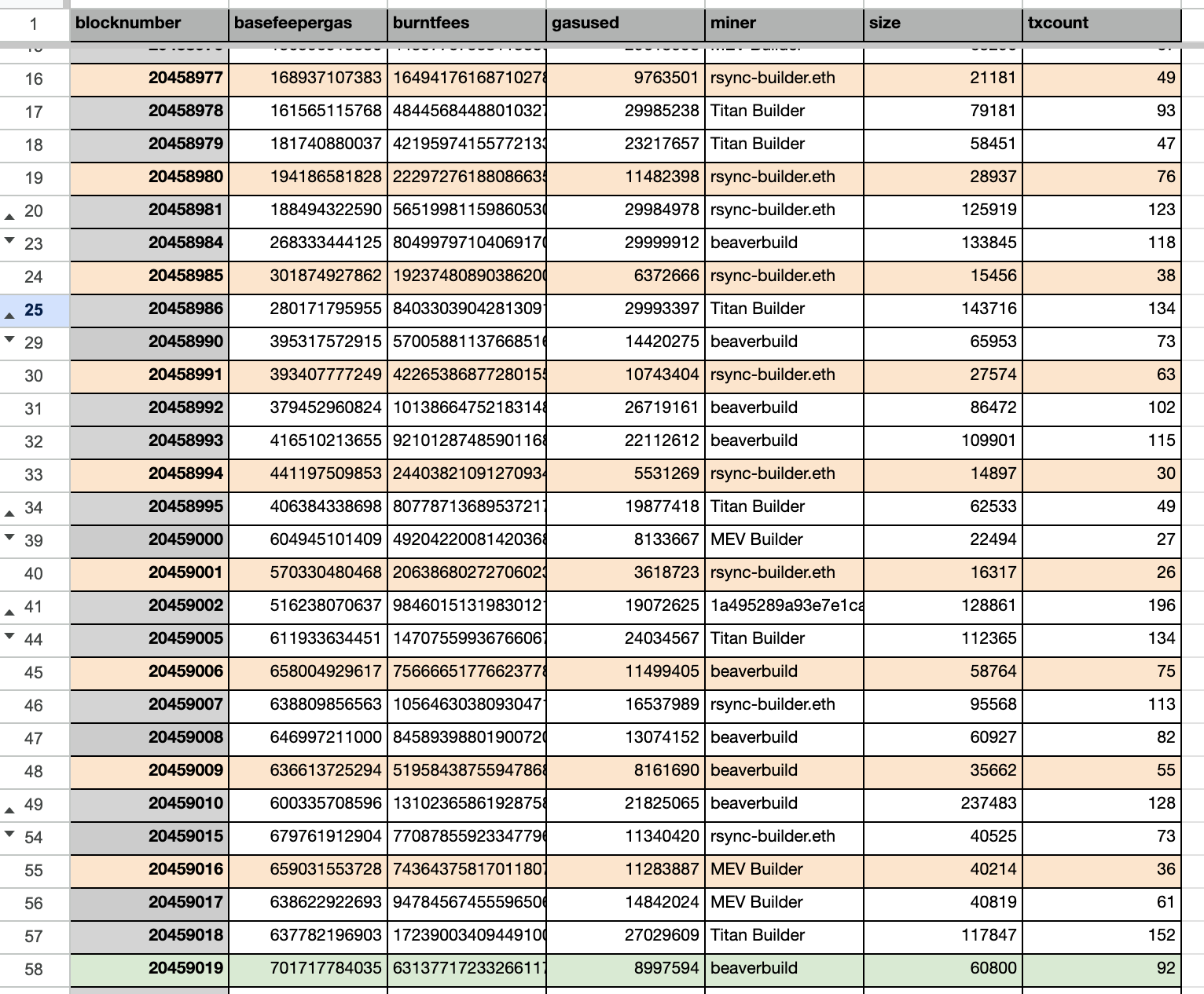 Notice all the dips in gas price along the upwards graph. Most of them are attributable to rsync-builder.eth, an MEV builder, that included significantly fewer transactions and lower gas usage in its blocks. You can check the highlighted blocks below that are built by rsync-builder.eth on Ethernow, most of them consists 100% private transactions.