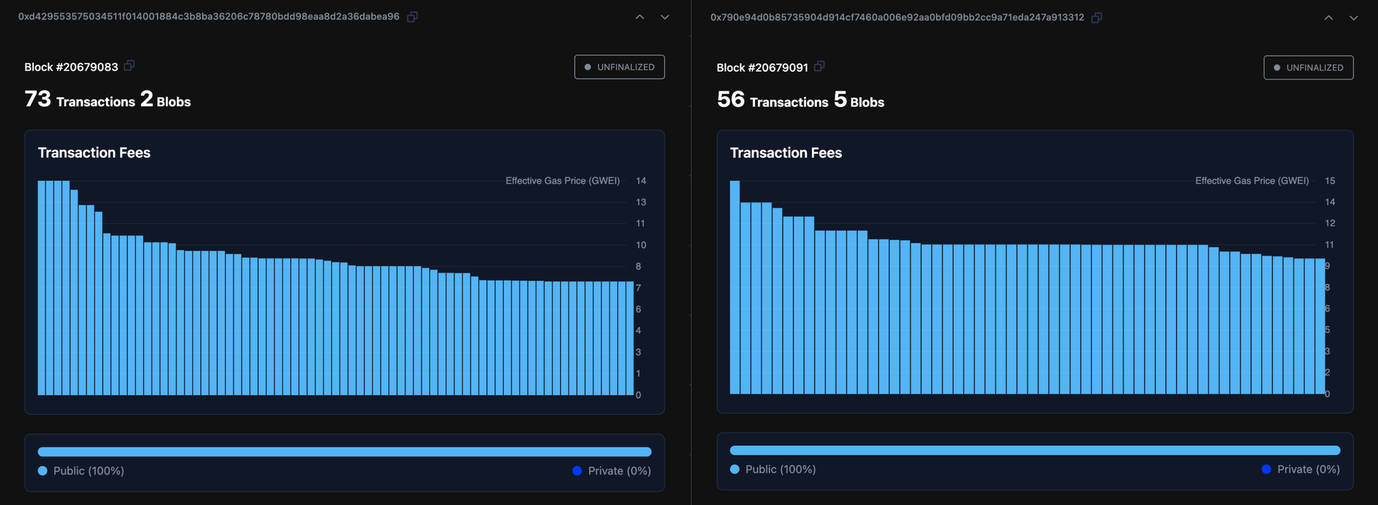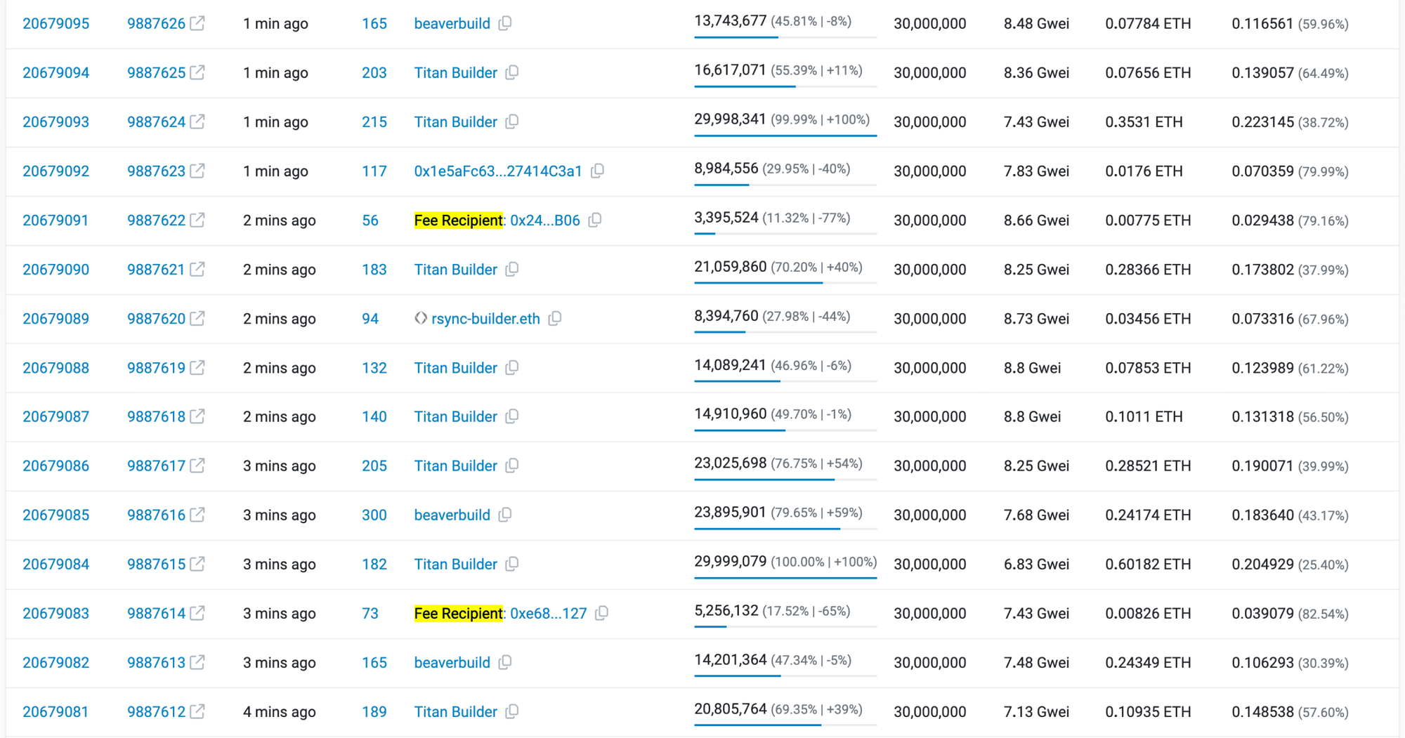 The screenshot below is a list of blocks and their respective block builders. The 2 "Fee Recipients" highlighted are vanilla builders, that only packs public transactions into their blocks. As a result, their blocks are only 15% full, leading to a drop in gas prices in the next block. Private transactions, which had to wait to be included in the next block, fill the following block completely, causing a spike in gas prices. Vanilla builders account for about 10% of all builders on Ethereum, so this phenomenon occurs roughly 10% of the time.
