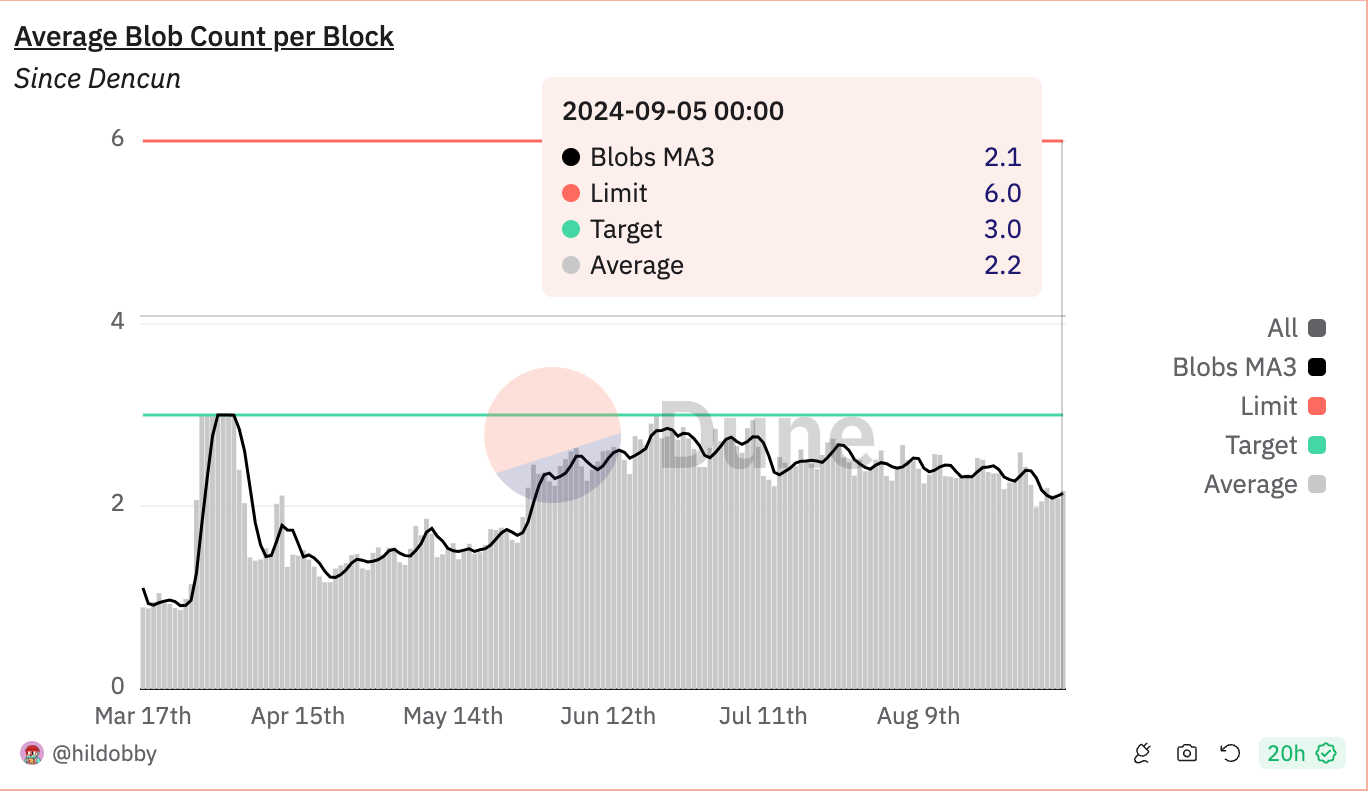 The Dencun upgrade has significantly reduced consistent block space demand by creating a separate blob fee market for L2s to commit data. While some might speculate that Ethereum gas prices could rise when blob counts exceed the 3-blob target, innovations are making data availability fees cheap enough that posting to calldata will likely remain a last resort. Additionally, the PeerDAS improvement, expected in the upcoming Pectra upgrade, will further scale blob space.