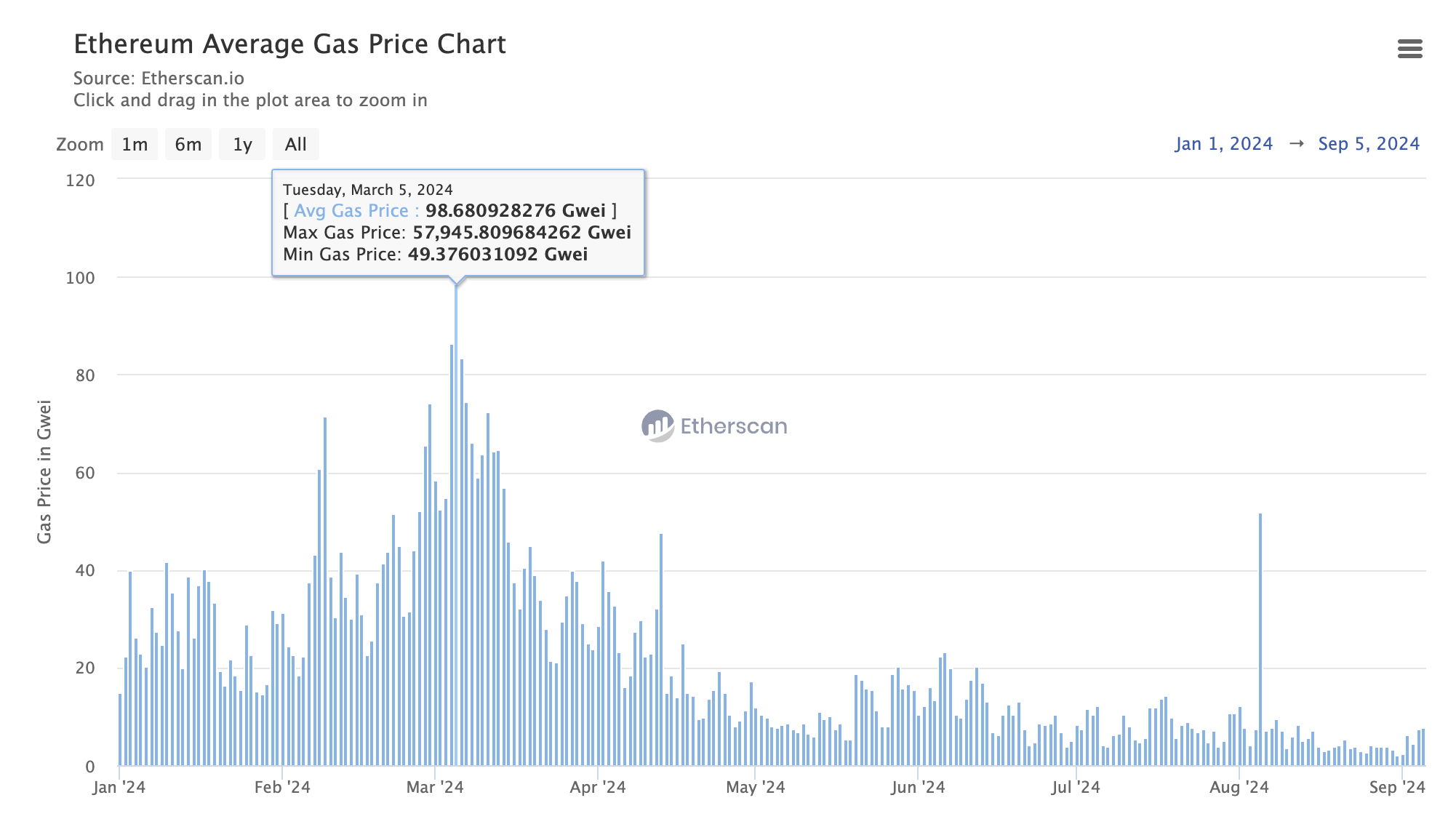 If you frequently transact on Ethereum, you may have noticed the sustained low gas prices in recent weeks. As shown in the chart below, the average gas price has steadily declined since its 2024 peak of 98.68 gwei on March 5.
