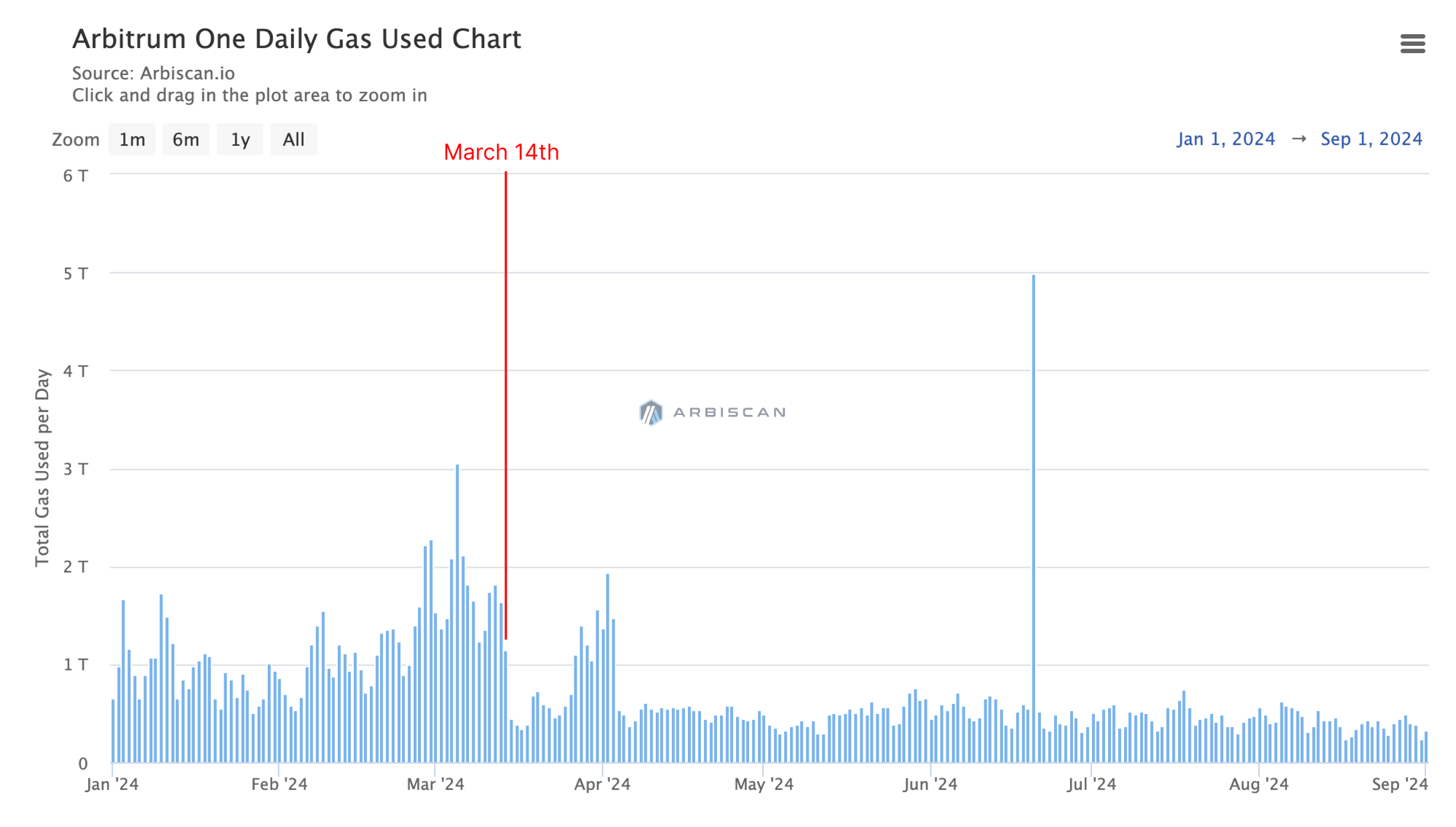 After the upgrade, however, Arbitrum consistently paid single-digit ETH fees. Even when Arbitrum One's gas usage spiked to nearly 5T on June 20th during LayerZero's token airdrop, the fees paid on Ethereum were just 39.82 ETH.