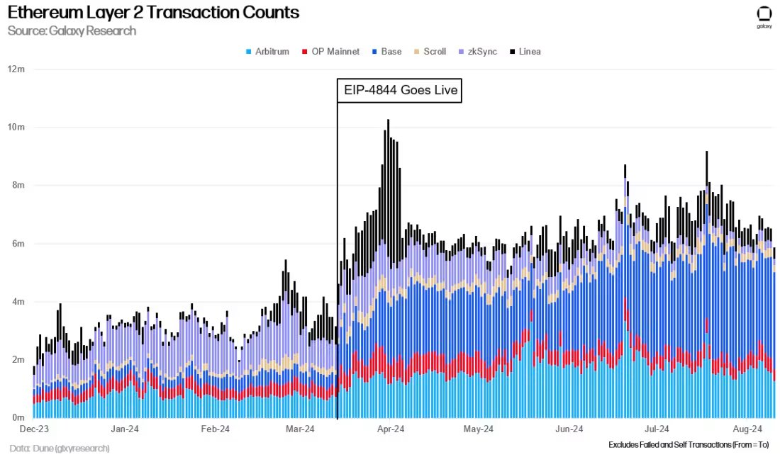 EIP-4844 introduced a separate fee market for L2s to post blobs on Ethereum, alleviating much of the consistent demand for Ethereum block space. As these fee savings are passed down to L2 users, activity on leading L2s surged post-Dencun.