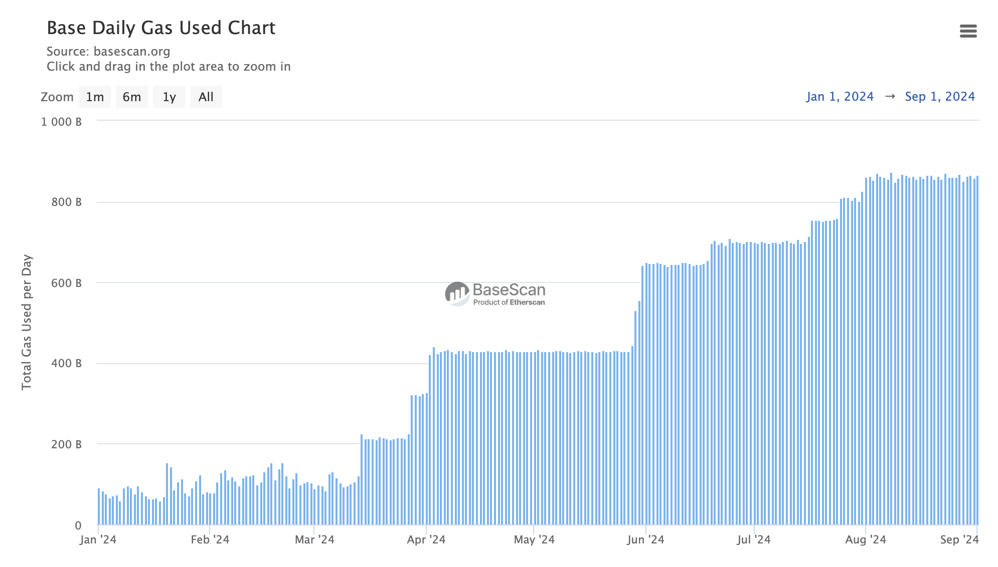 With lower consistent demand from L2s and the rise of private transactions causing base fee volatility, Ethereum gas prices are expected to stay low if current conditions persist. However, this doesn’t mean Ethereum isn’t being used. In fact, daily gas usage has been trending upward throughout 2024, reaching an all-time high of 109,140.10M in gas usage on September 1st so far.