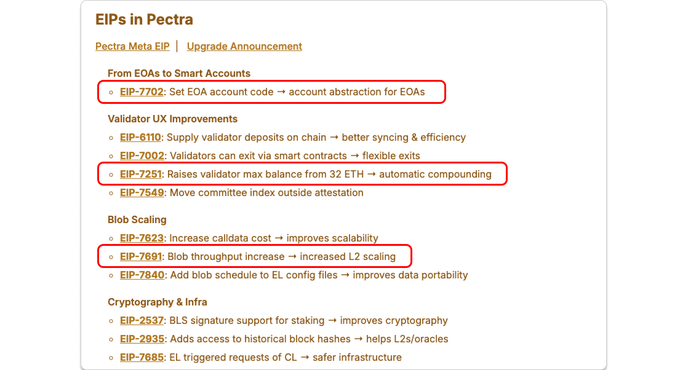 Pectra raises the validator balance ceiling from 32 ETH to 2,048 ETH, allowing large operators to merge many small validators into a handful of “super-validators” and reducing network overhead. Read more on staking-related improvements covered in the previous article.