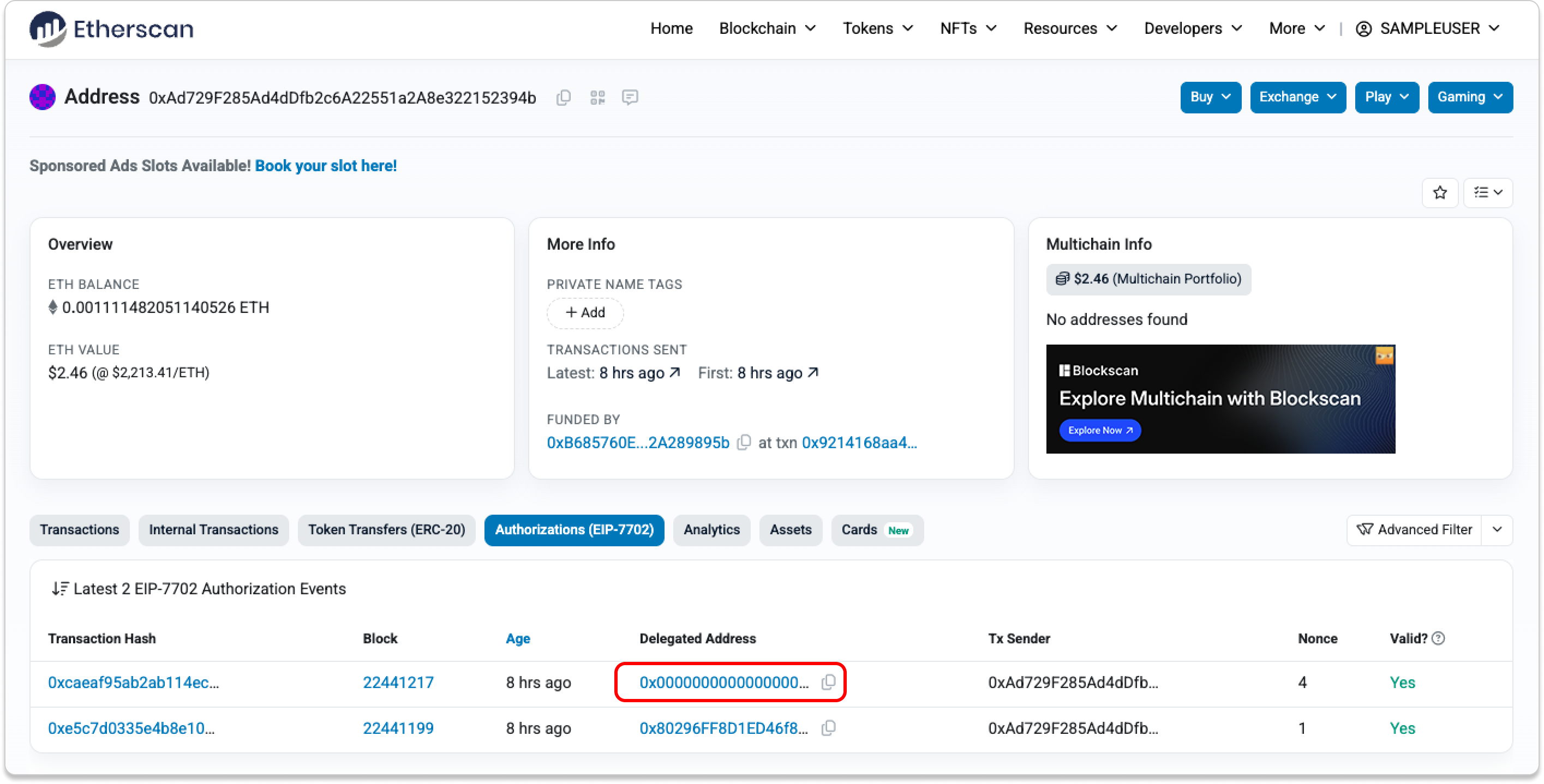 The EOA's address page shows you: