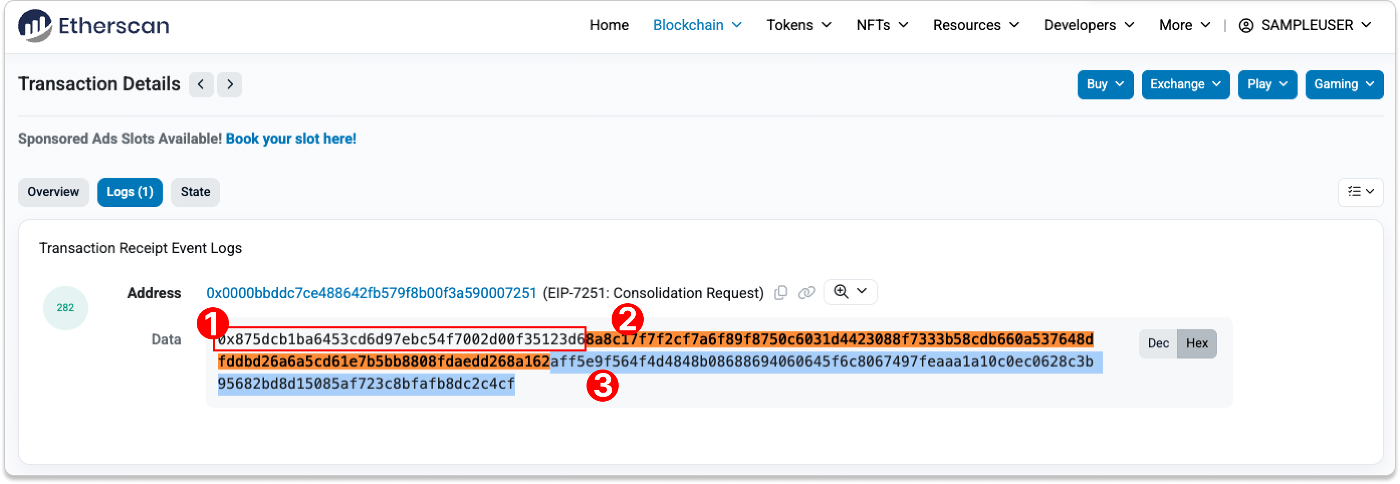 On Etherscan, simply navigate to the Consolidation Request Contract to inspect any one of the transaction. We'll use this consolidation request transaction as an example: