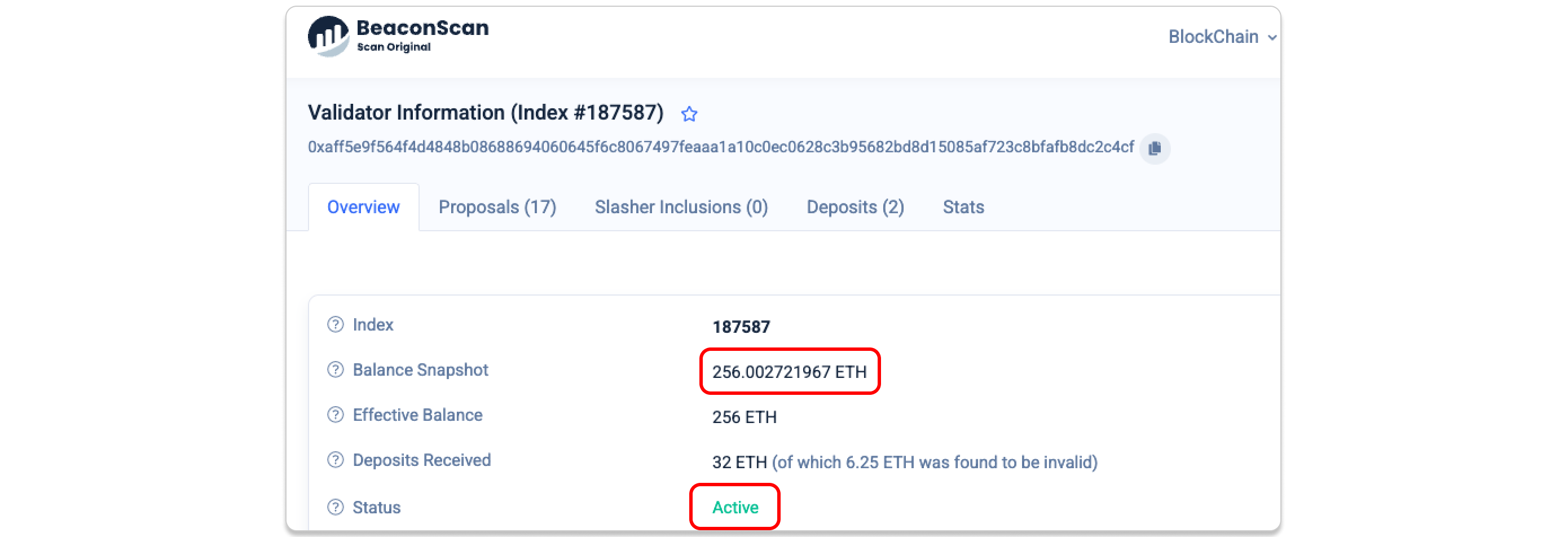 - This is the validator key that receives the transferred stake. The screenshot below confirms the higher effective balance once the consolidation is credited.