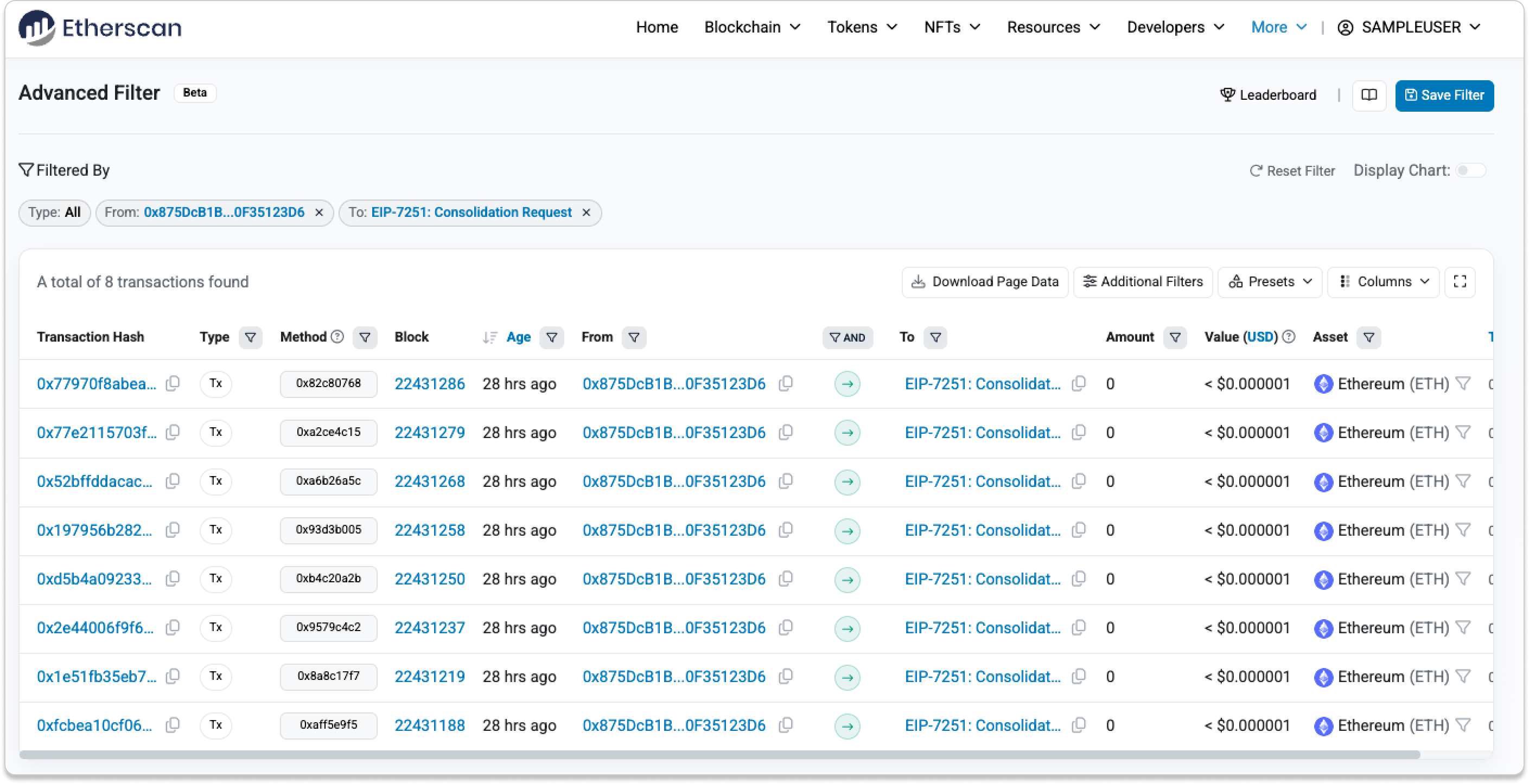 To see how many consolidation requests an EL address has made, use Advanced Filter with the AND operator. In this example, the address submitted 8 consolidation requests, resulting in a total effective balance of 256 ETH.