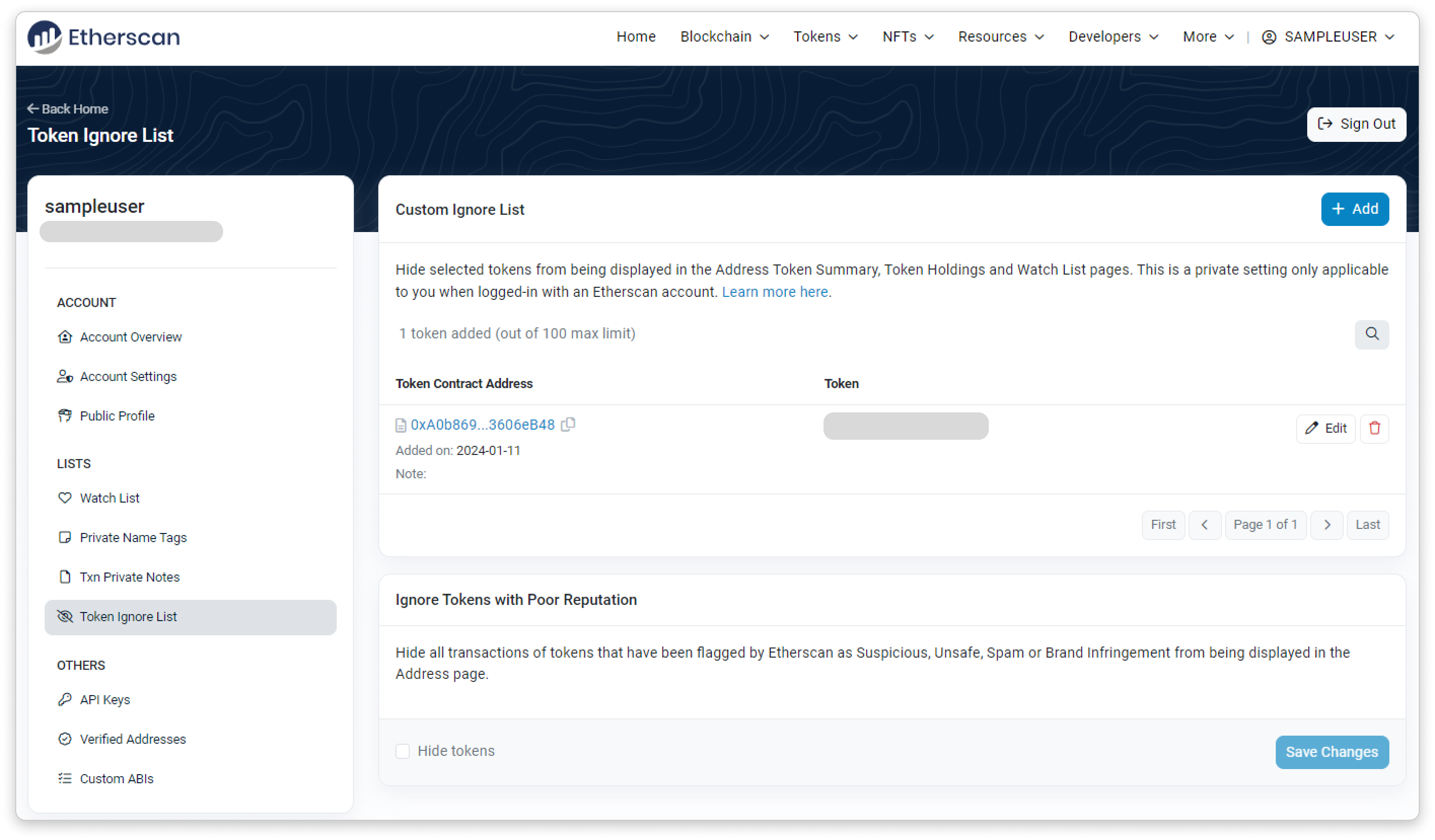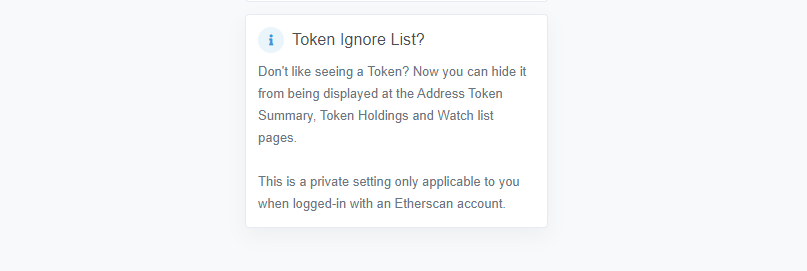 To use this feature, users can log in to their Etherscan account and add the unwanted token to their Private Token Ignore List on the user dashboard. And as long as you are logged into your Etherscan account while browsing the site, the tokens on your ignore list will be hidden from all token holdings of all addresses. The same also applies to all the addresses listed under the user's Etherscan Watch List.