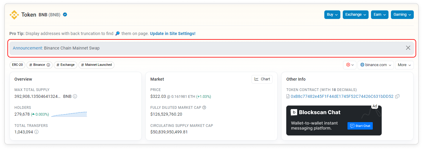 Public notes provide users with notifications about information related to address, contract, token, transaction, or block pages. Displaying the public note gives users a better understanding of the page. Users can choose to keep the public note visible or remove it by clicking on the cross icon at the end of the public note. For example, the public note may contain an announcement about the BNB token being migrated to its own mainnet.