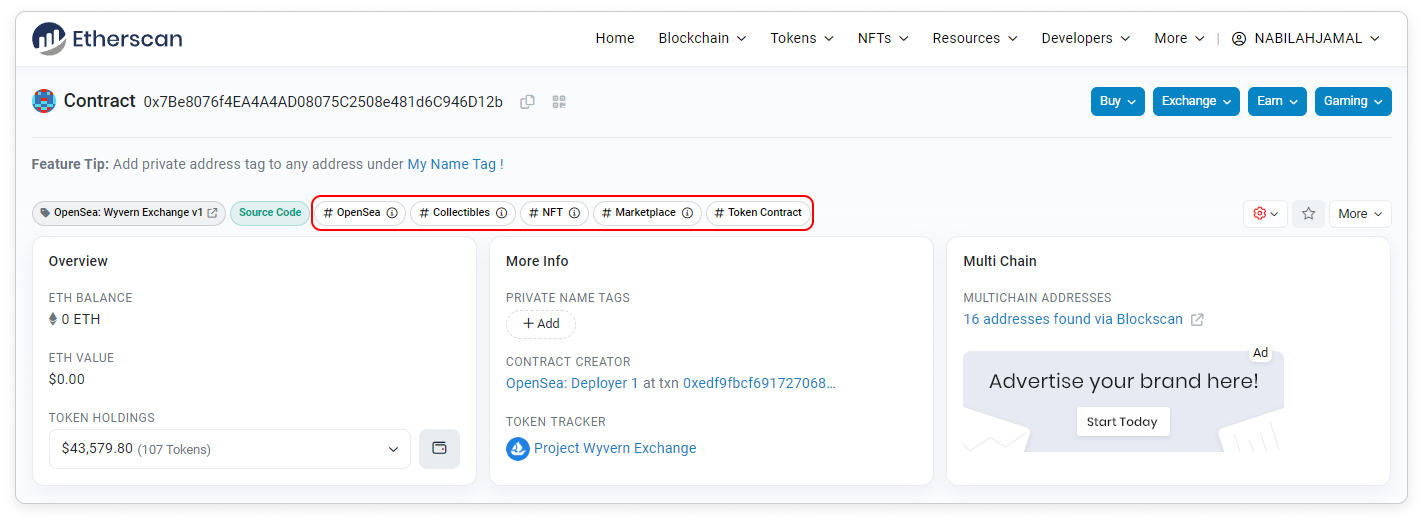 Labels indicate a category that an address, token, transaction or block page belongs to. Displaying the label allows users to easily figure out more context for the page. Clicking a label allows them to see other pages related to the same label. Some examples of labels include a project name (Binance, Uniswap) and a type of token (NFT, stablecoin). In the image below, users can see that this contract is related to Opensea, Collectibles, NFTs, Marketplace and Token Contract.