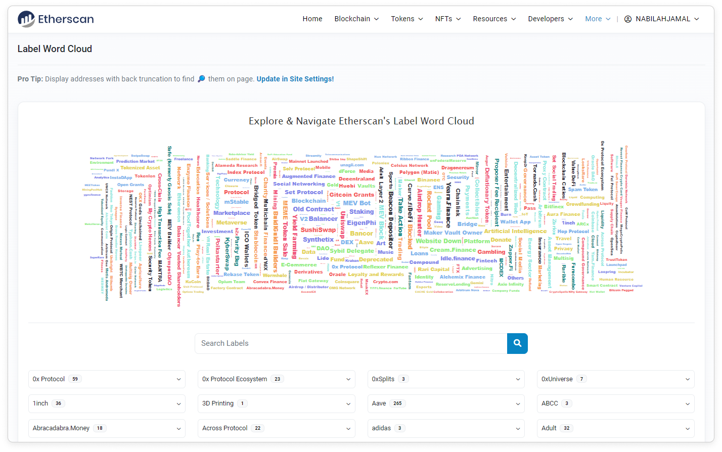 Users may browse Etherscan's wide variety of labels by exploring the Label Word Cloud page under More > Tools > Label Word Cloud.
