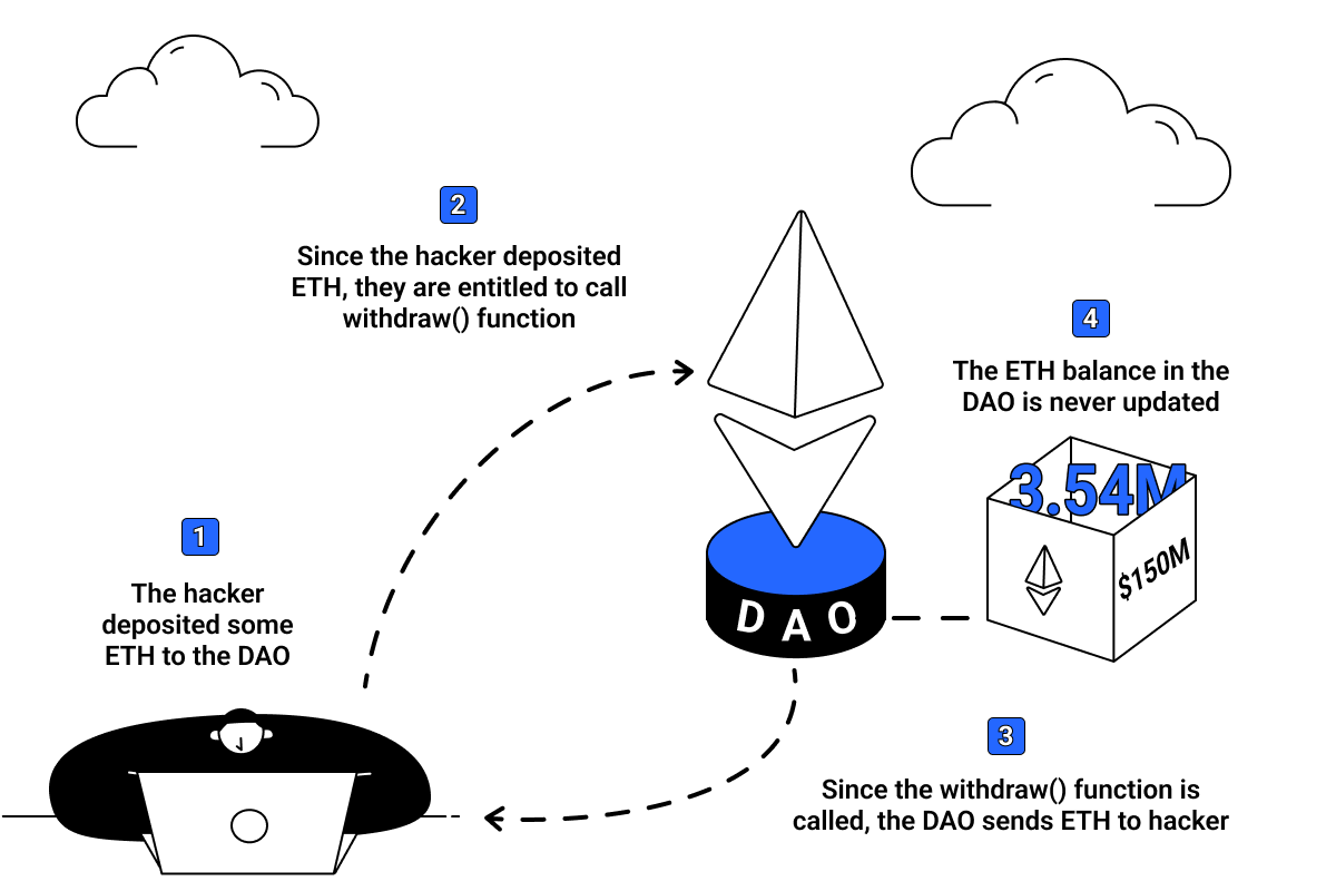 The illustration above shows how the attack happened, and it all began when the hacker deploys a smart contract that has a fallback function called receive(). The hacker pretended to be an investor by depositing some Ether into the DAO. With this, the hacker is entitled to call a fallback function code called withdraw() from the DAO’s smart contract. The withdraw() function is triggered to send Ether to the hacker’s smart contract. When the hacker receives the funds, the receive() function is triggered to call the withdraw() function again from the DAO’s smart contract.