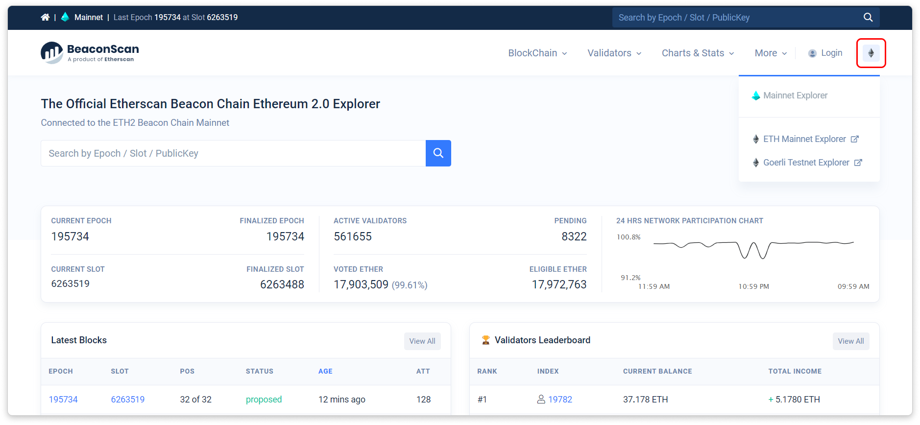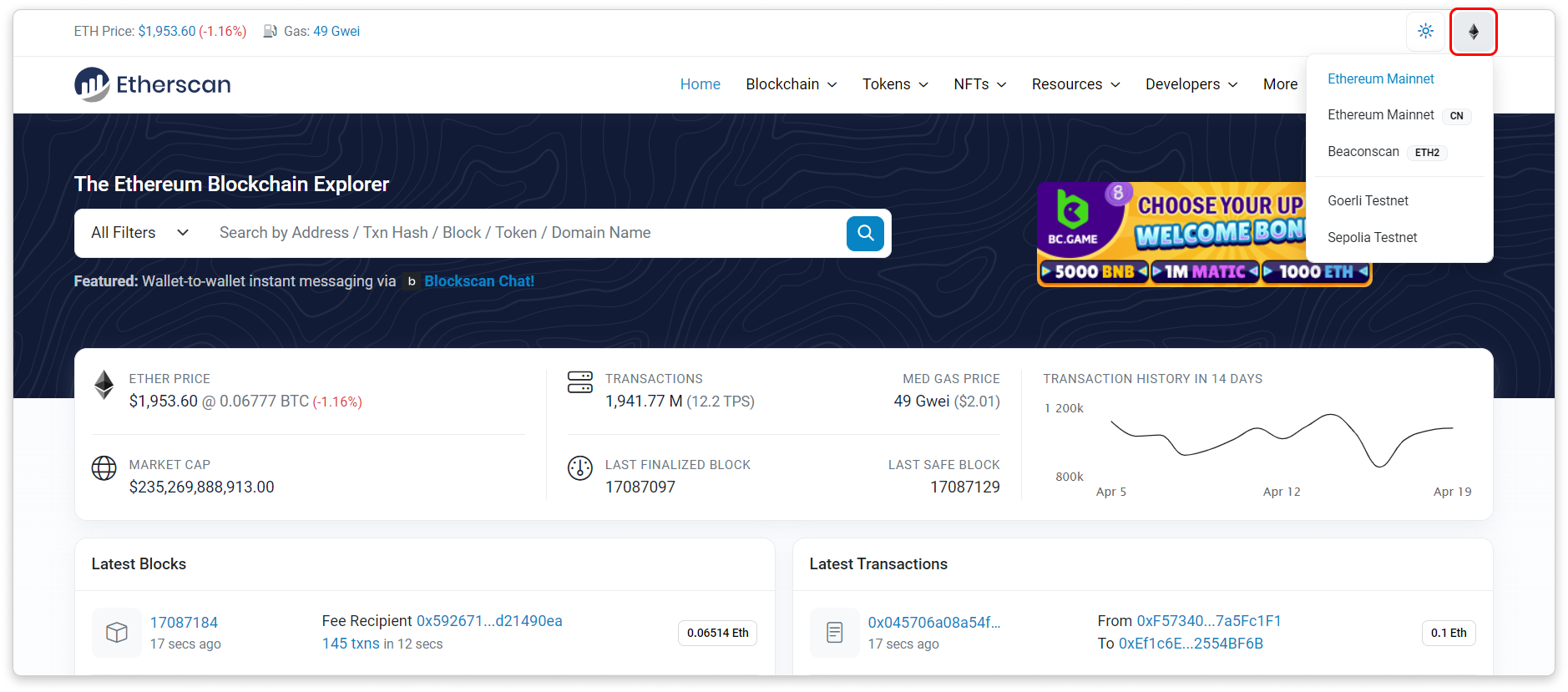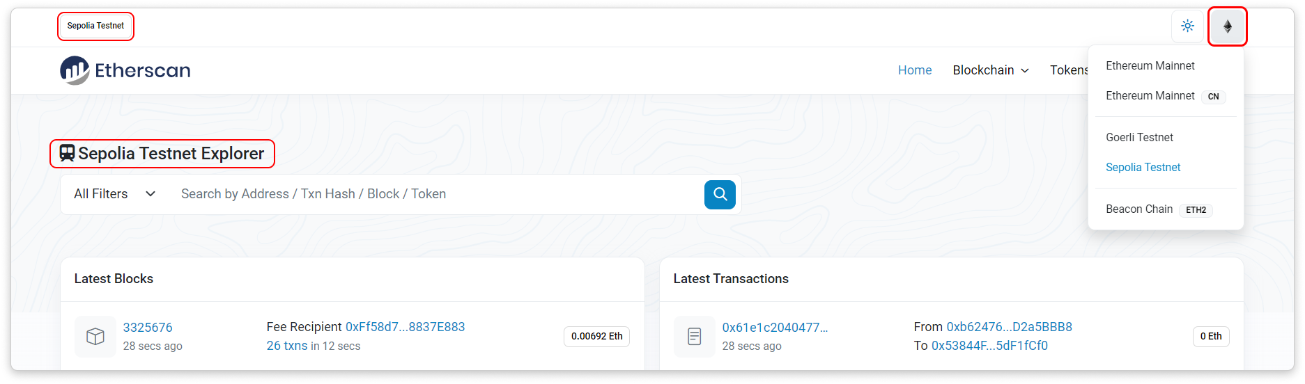 When users click on the Ethereum logo at the top right of the website (which is accessible from any page on Etherscan), a dropdown menu will appear, which lists the contents mentioned above. In this dropdown menu, users can access Goerli and Sepolia Testnet explorers, as well as Beaconscan (Eth2) and Ethereum Mainnet in Chinese.