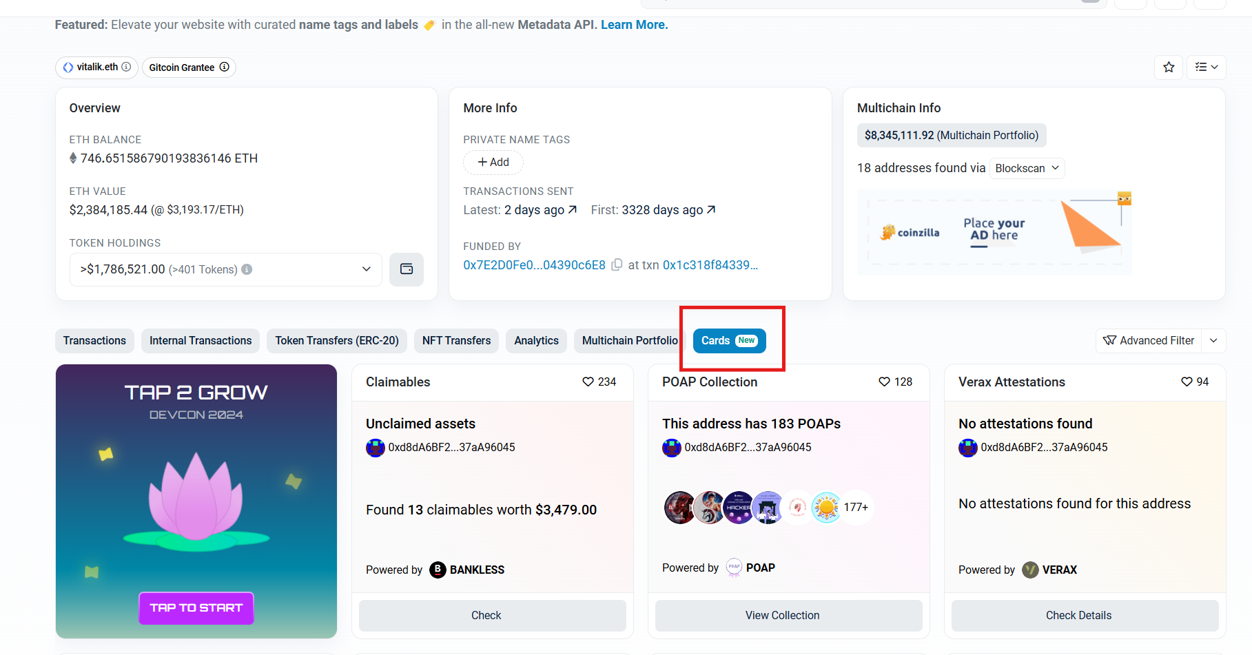 - Open the Game Card: Go to the Cards tab of an address or simply this address.