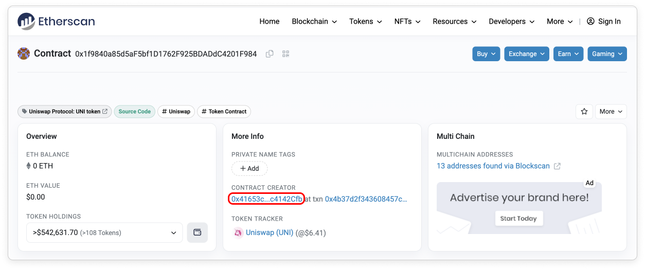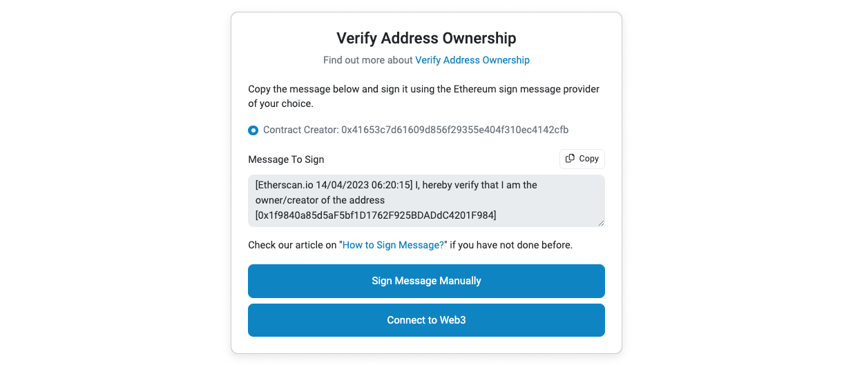 If you have previously signed a message with an address that is not the creator of the token contract, you would need to sign a new message to verify ownership of the token contract. You can check the contract creator address by referring to the section highlighted in the screenshot below: