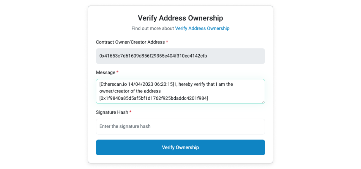 - Paste it into the Signature Hash field in the Verify Ownership interface and proceed with Verify Ownership.