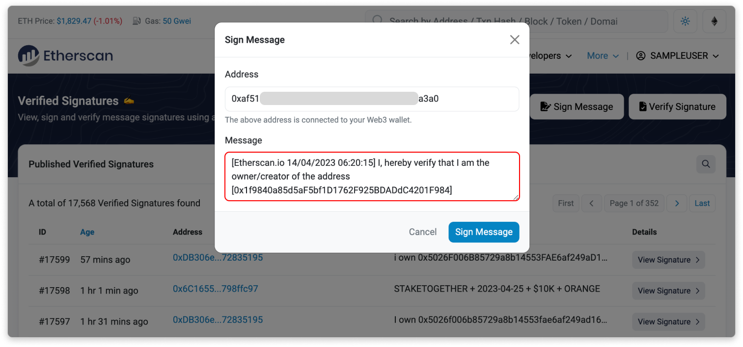- Click on Sign Message and proceed with signing the message with the Web3 wallet that popped-up.