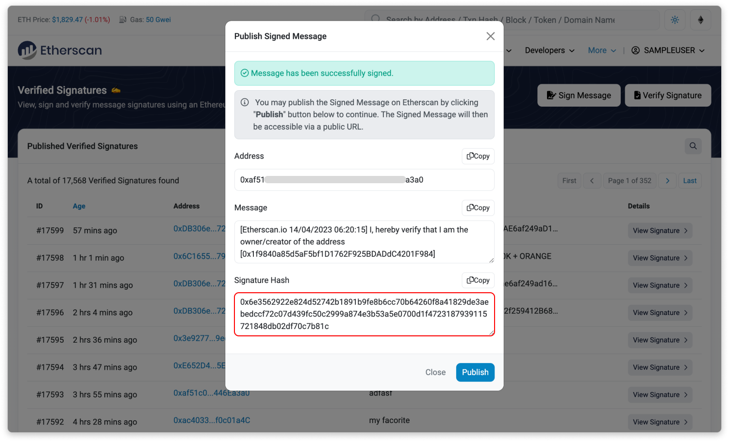 - After signing the message, copy the Signature Hash from the Publish Signed Message interface.