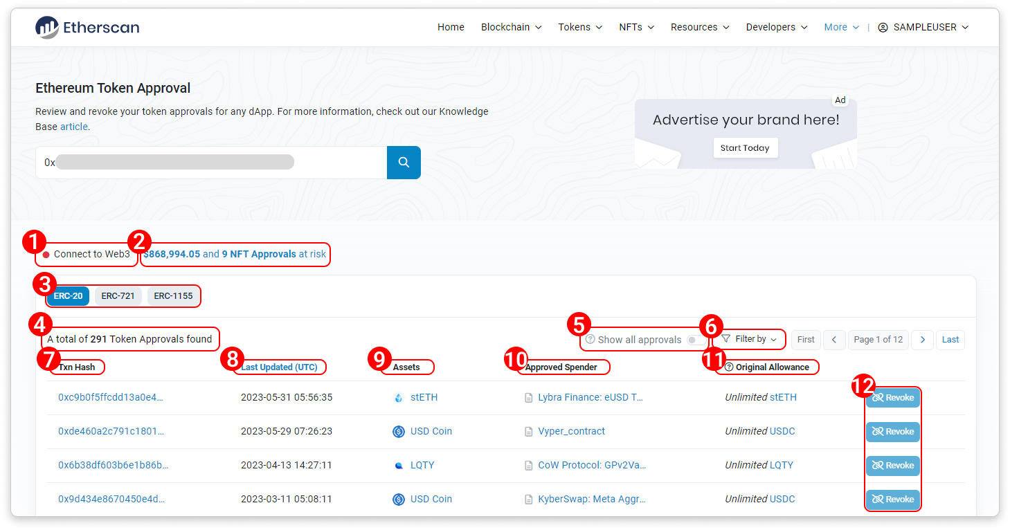 - Token Standards: Navigate between different token standards to view the token approvals granted to smart contracts for a particular token standard. The token standards include ERC-20, ERC-721, and ERC-1155.