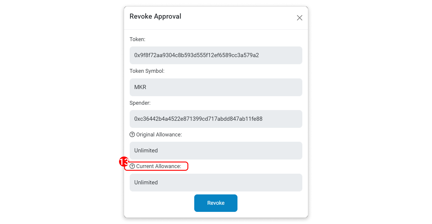 Upon clicking on the Revoke button, you will be able to view the current allowance of a particular asset (as shown below):