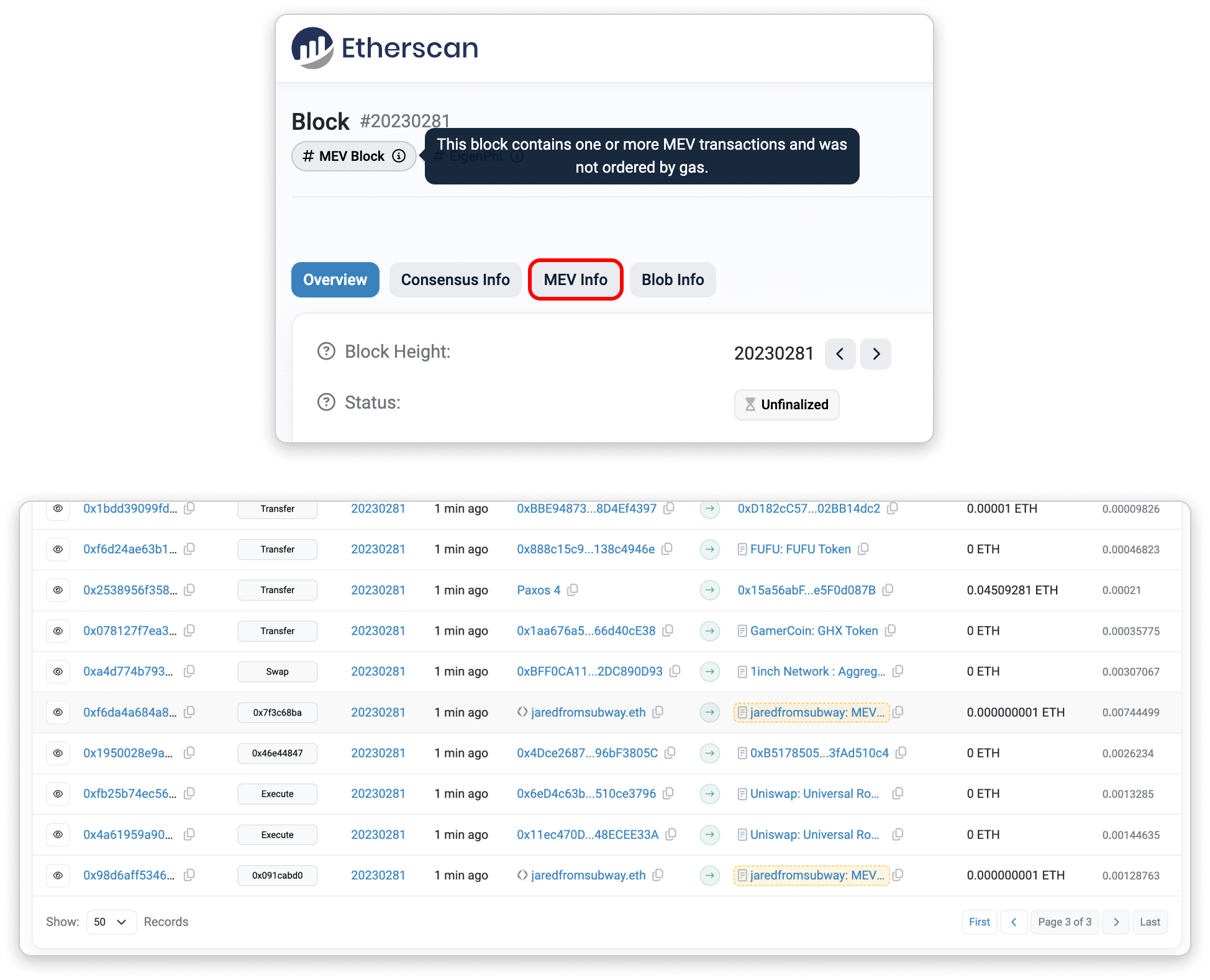 Today, MEV-Boost is so popular that 90% of all Ethereum blocks are built through it. You could go to a random block page on Etherscan and can find that it contains at least one MEV transaction. MEV transactions are sent as bundles by searchers directly to builders, as opposed to most user transactions that go straight to the public mempool.