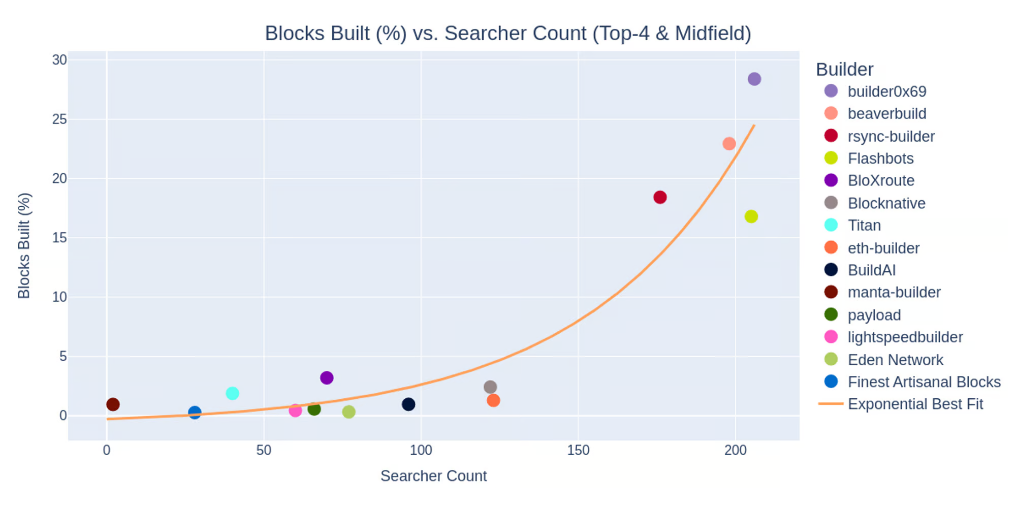 As builders gain more market share, searchers tend to prefer submitting MEV bundles to them more. This may be due to a higher chance for their bundles to be included in Ethereum blocks and a higher perceived reputation that the MEV bundles are safer with these builders. This potentially restricts the ability of new builders to gain traction and further concentrates builder market share among a few leading builders.