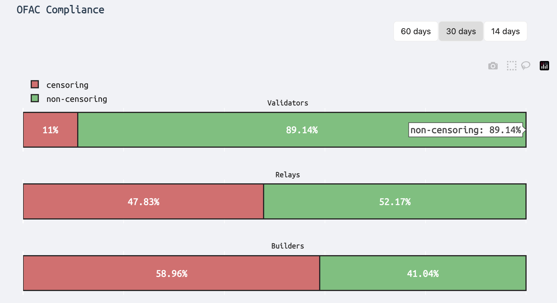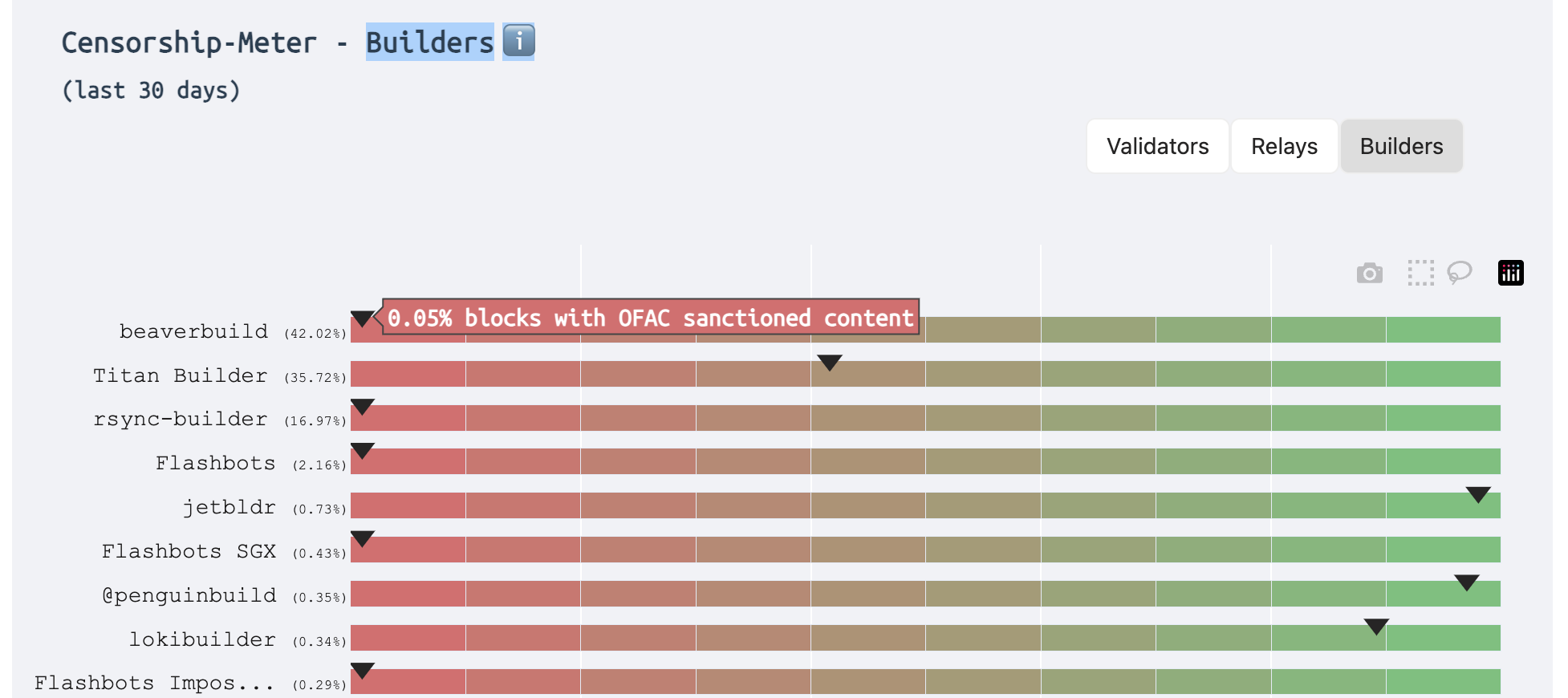 Evidently, the top builder produces ~45% of all blocks in the past 30 days (at time of writing). 2 of the top 4 builders, beaverbuild & rsync-builder, with a combined market share of ~60%, are censoring OFAC-sanctioned transactions.
