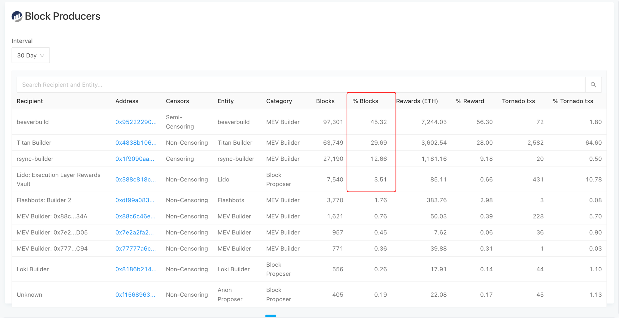 Approximately 90% of all Ethereum blocks have been built by just 4 block producers in the past 30 days. The largest builder, beaverbuild, holds a market share of nearly 50%. With both beaverbuild & rsync-builder censoring OFAC-sanctioned transactions, it means that only about 40% of blocks are censorship resistant.