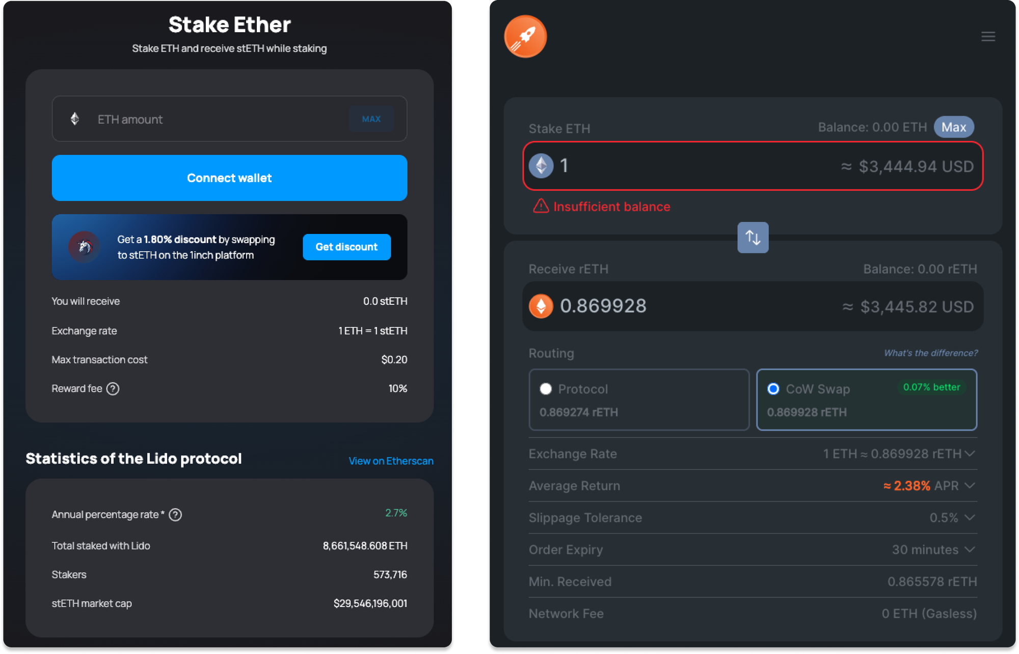 If you prefer convenience, liquid staking options such as stETH (≈2.7% APR) or rETH (≈2.4% APR) allow you to earn staking rewards through a tokenized version of your staked ETH. These liquid staking tokens (LSTs) can also be used in other DeFi protocols, for example as collateral for loans or liquidity provision, allowing you to combine multiple yield sources across the ecosystem.