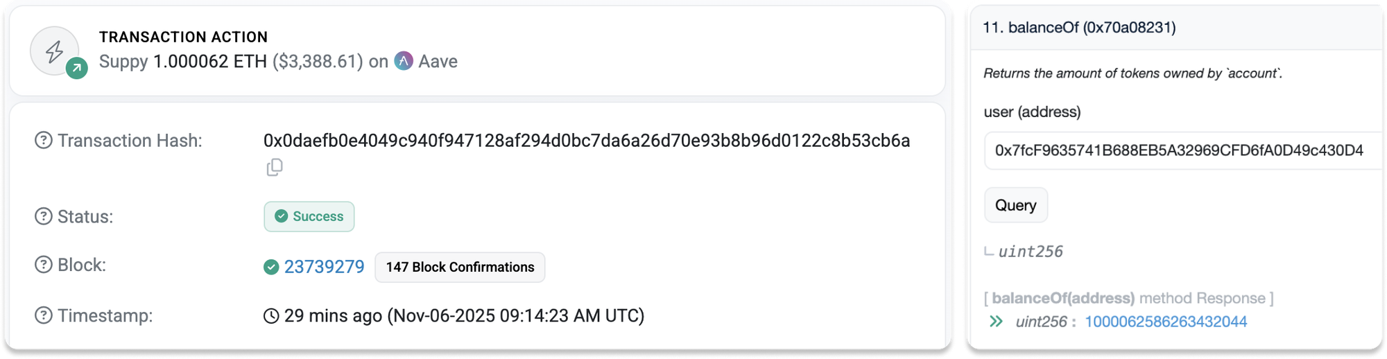 If you have supplied ETH to Aave and want to confirm your position, you can read your balance directly from the contract’s balanceOf function on Etherscan.