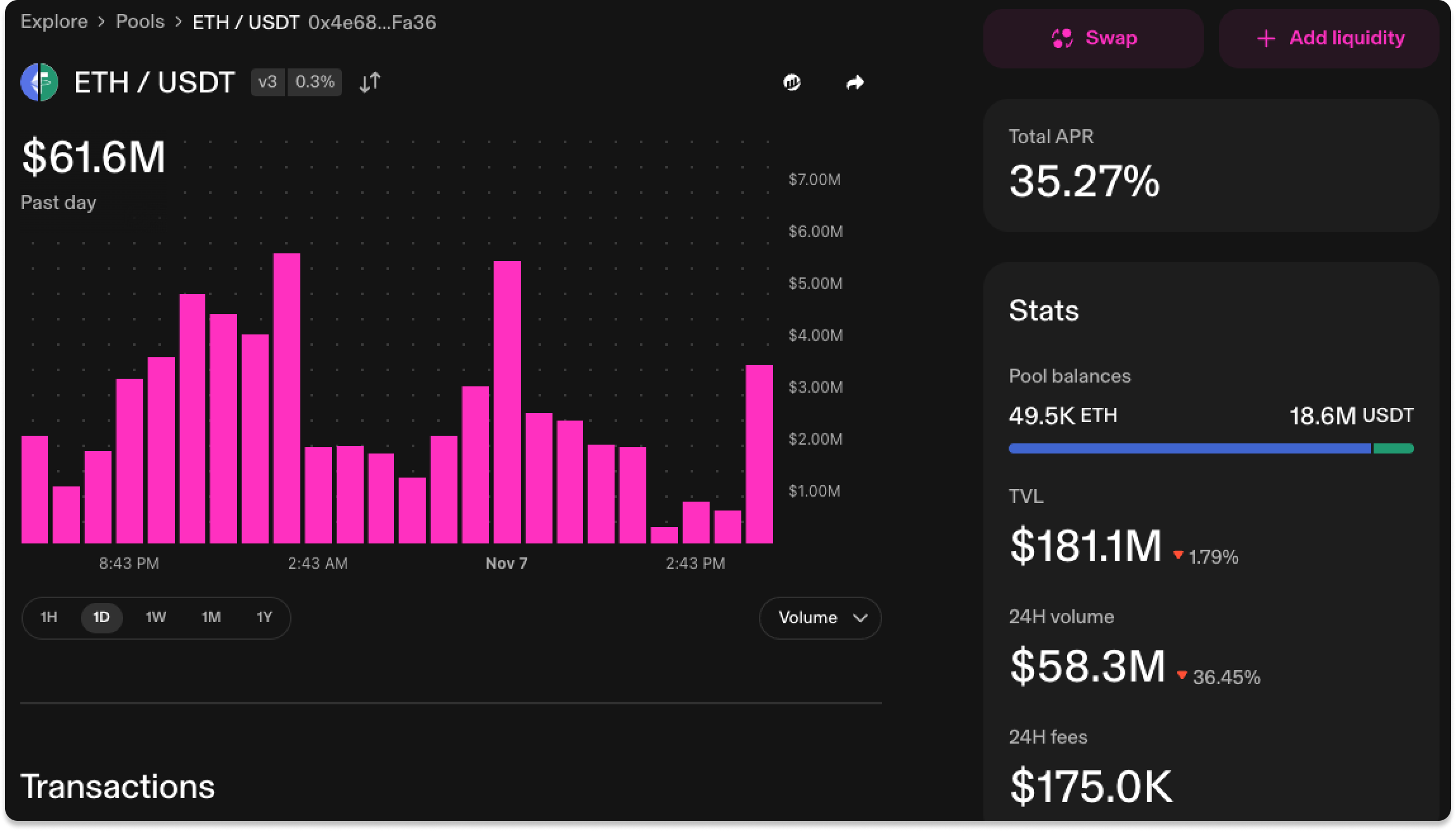 Returns vary depending on trading volume, fee structure, and pool choices, among others. For example, on Uniswap, the ETH/USDT v3 pool currently offers around 35.27% APR at a 0.3% fee tier. On the other hand, the WBTC/USDC v3 pool offers 22.77% total APR at a 0.3% fee tier.